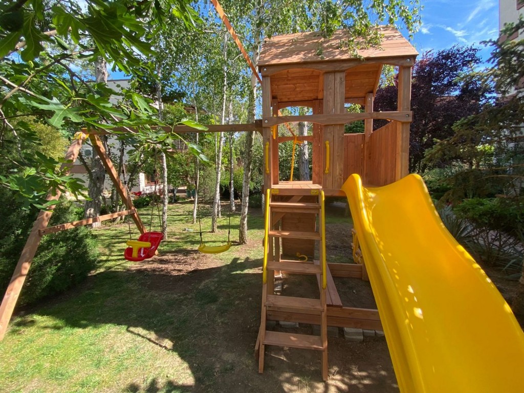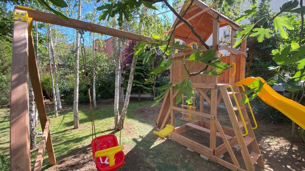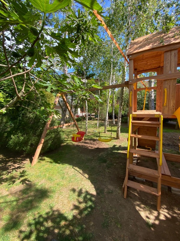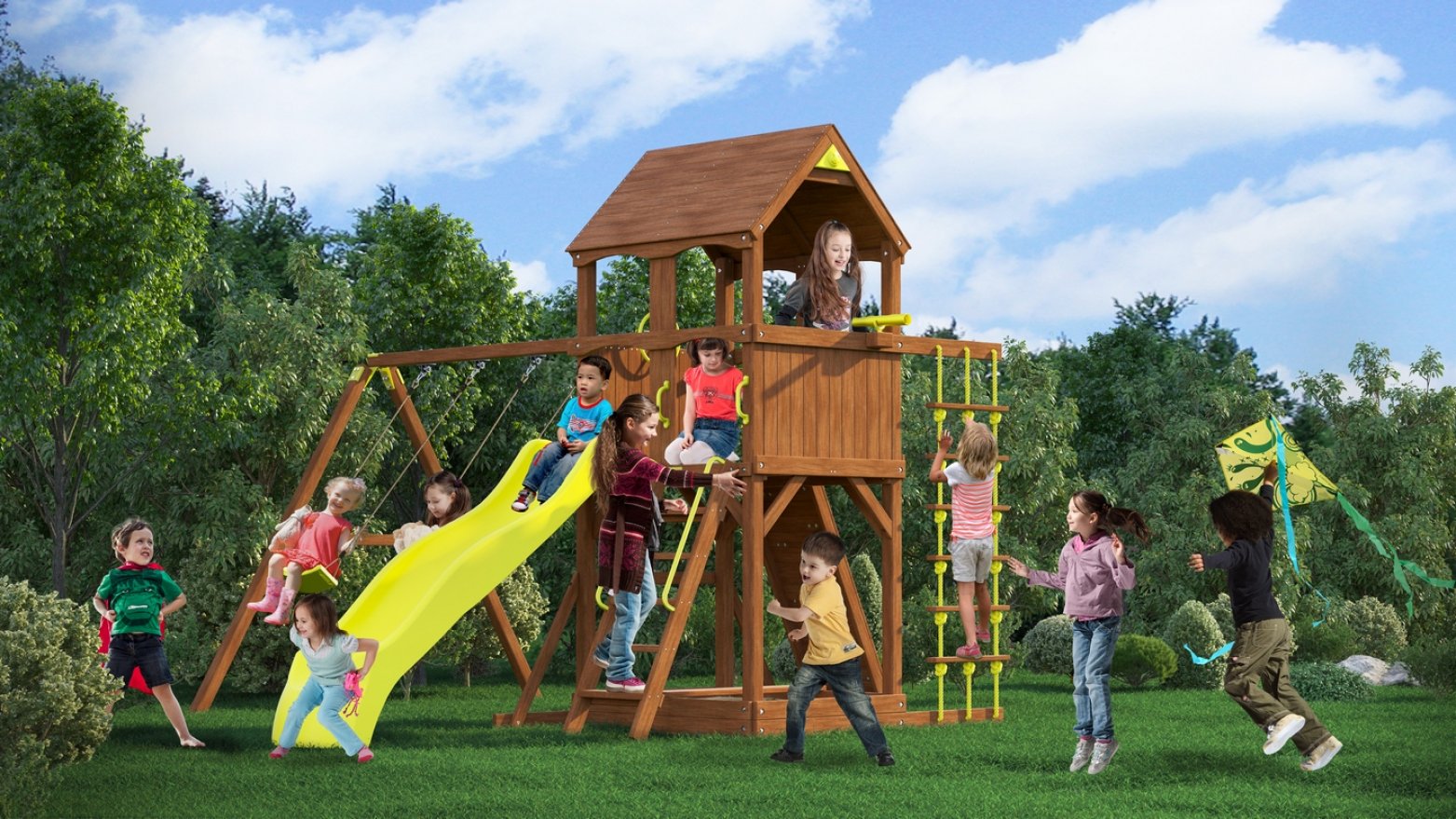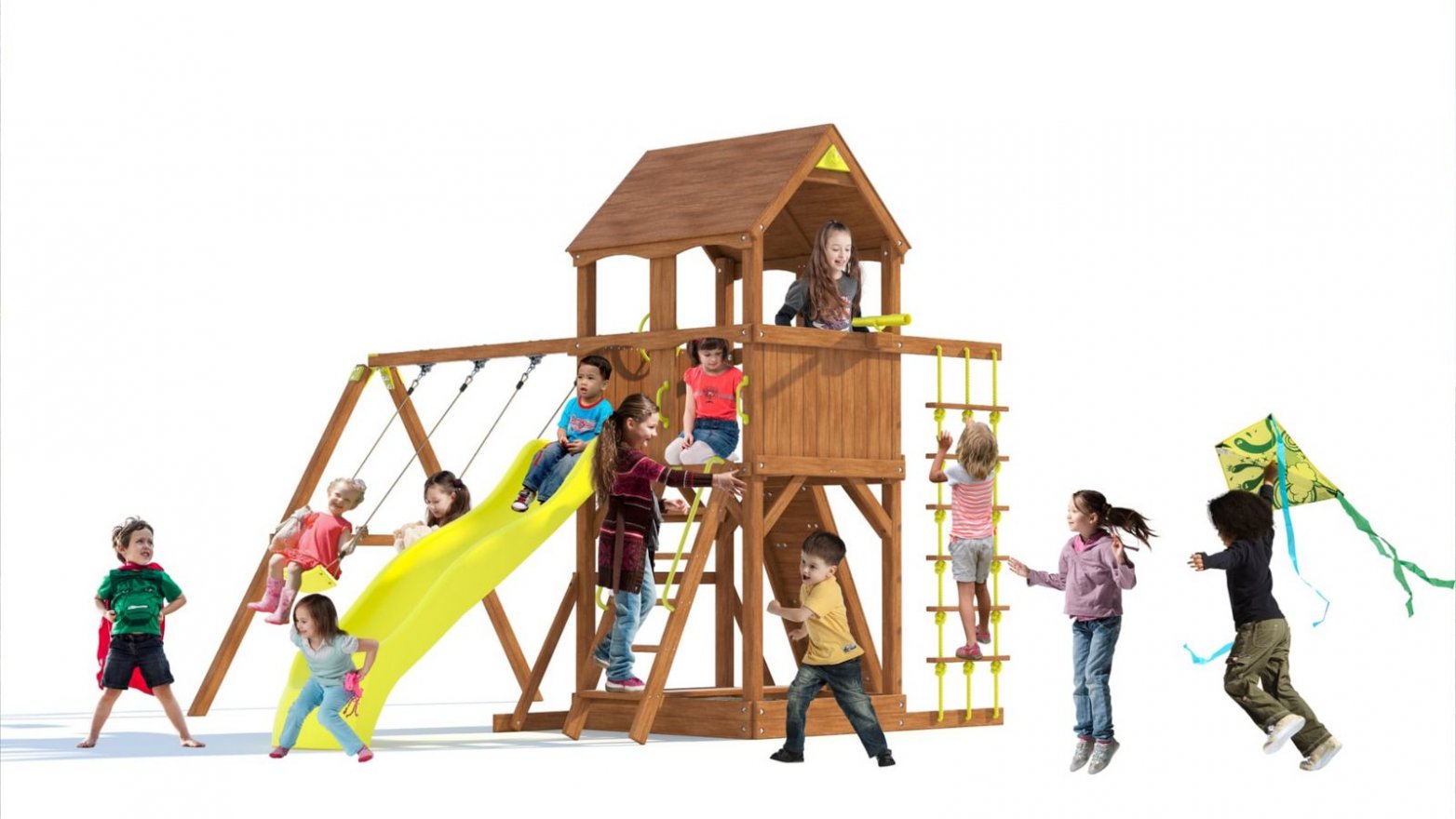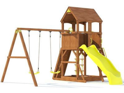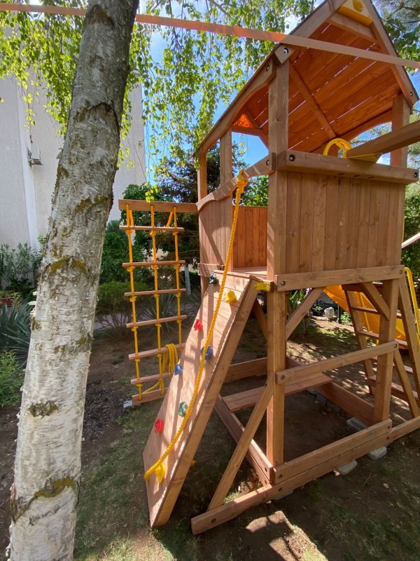 Площадка включает множество игровых зон: подвесные качели, веревочную лестницу, скалодром и песочницу, которую можно организовать под фортом. В комплекте углубленный безопасный спуск для детей с высокими бортами.