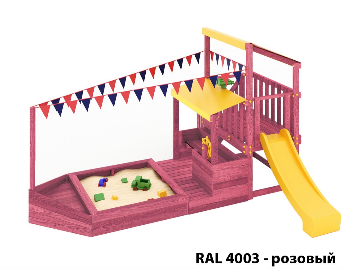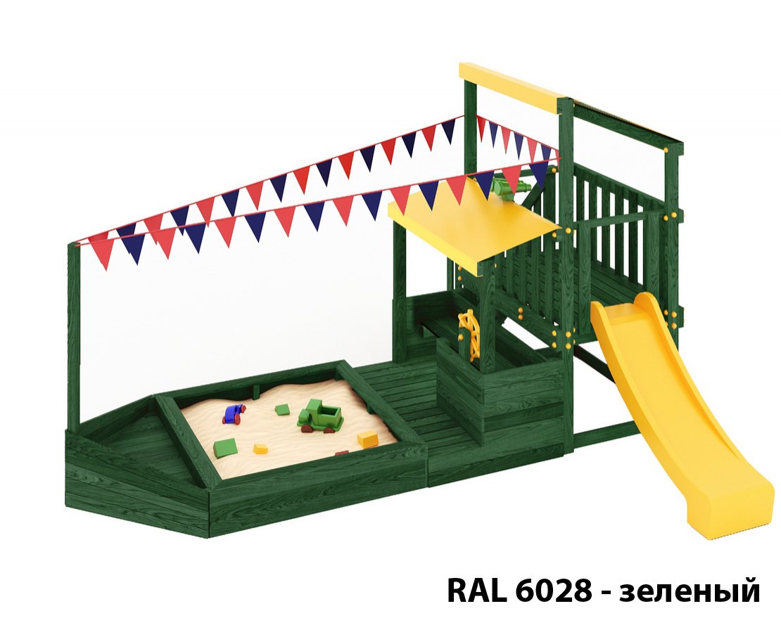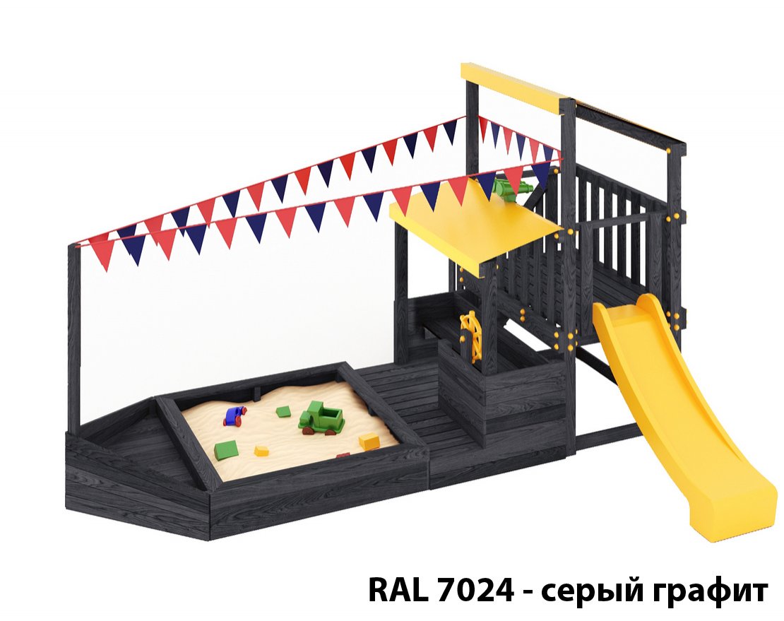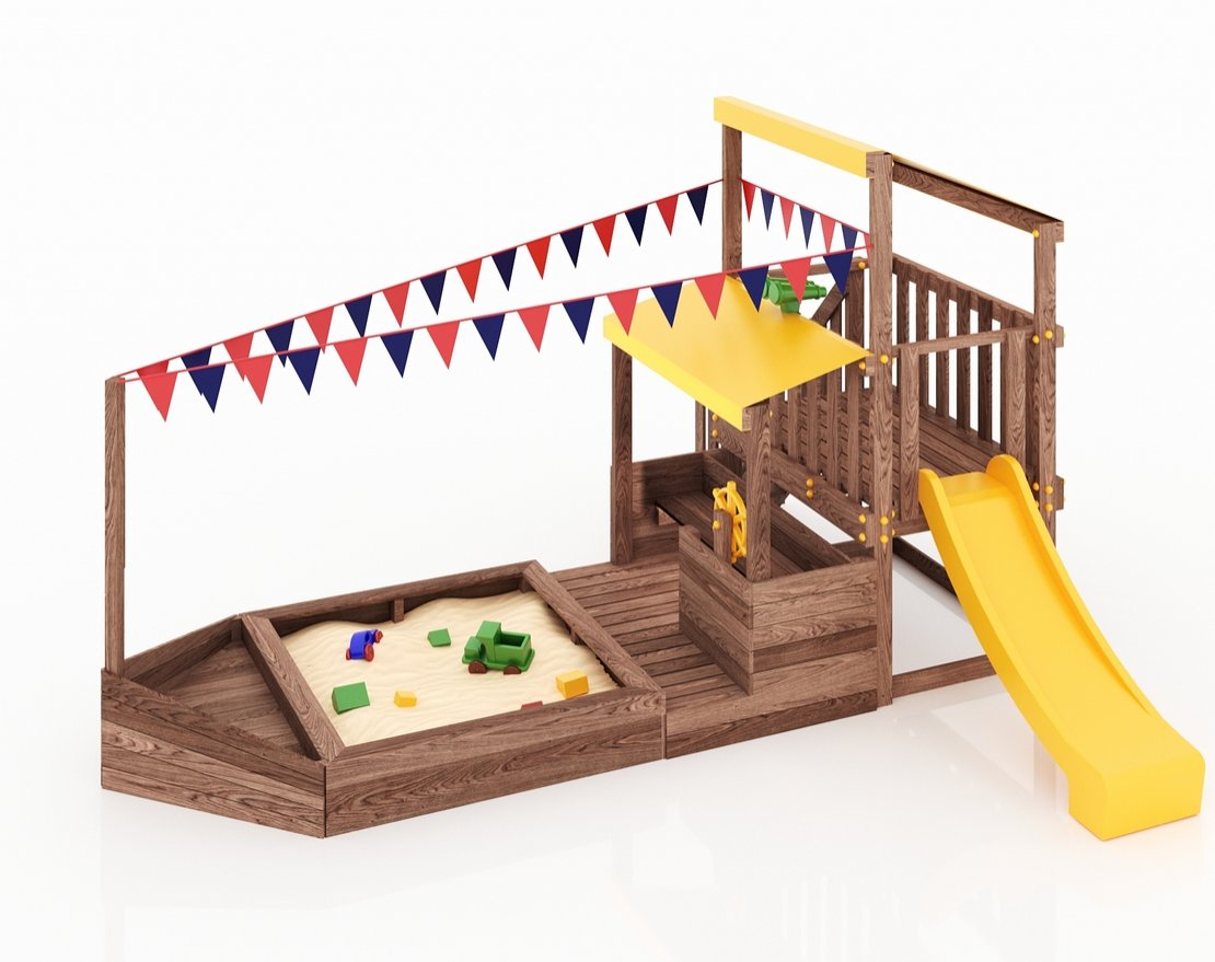 Детская песочница-кораблик, включающая в себя штурманскую рубку и капитанский мостик с горкой с высоты 900 мм с флажками, а также две крыши закрытые тентом, чтобы можно было отправиться в дальнее плавание даже под дождем.