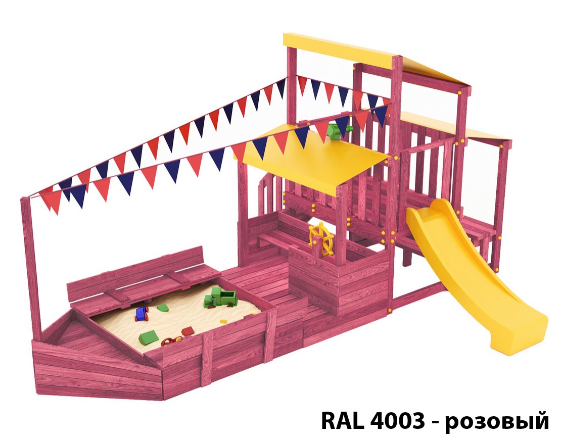 Детская песочница с крышкой-лавочкой и кораблик, включающий в себя штурманскую рубку и капитанский мостик с горкой с высоты 900 мм с флажками.