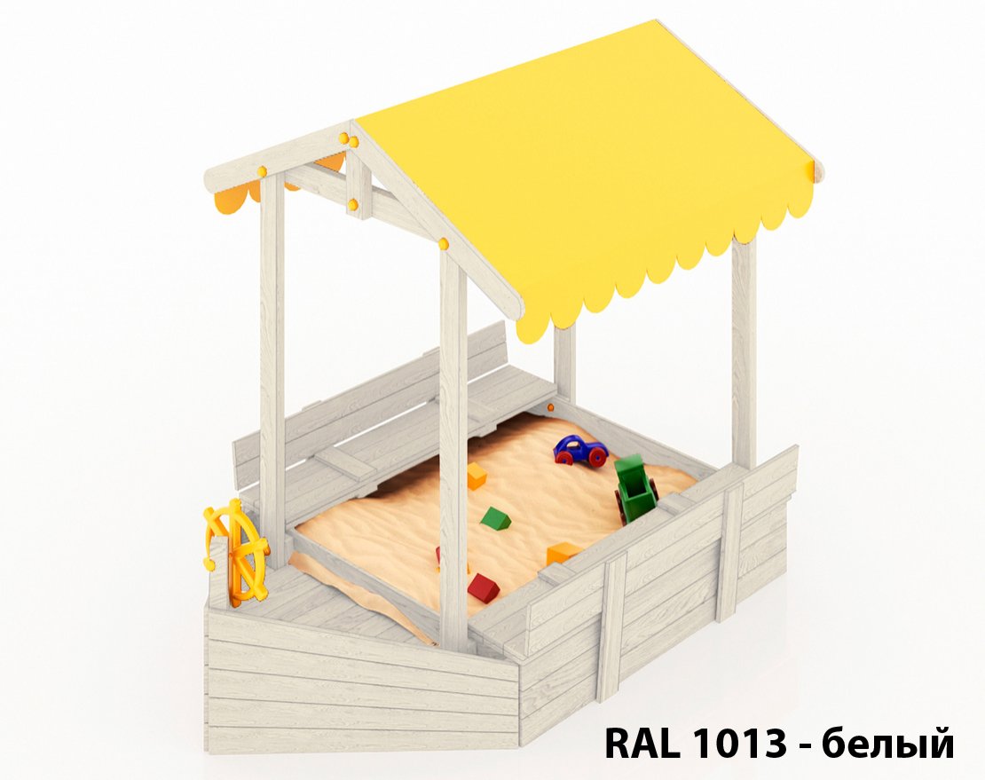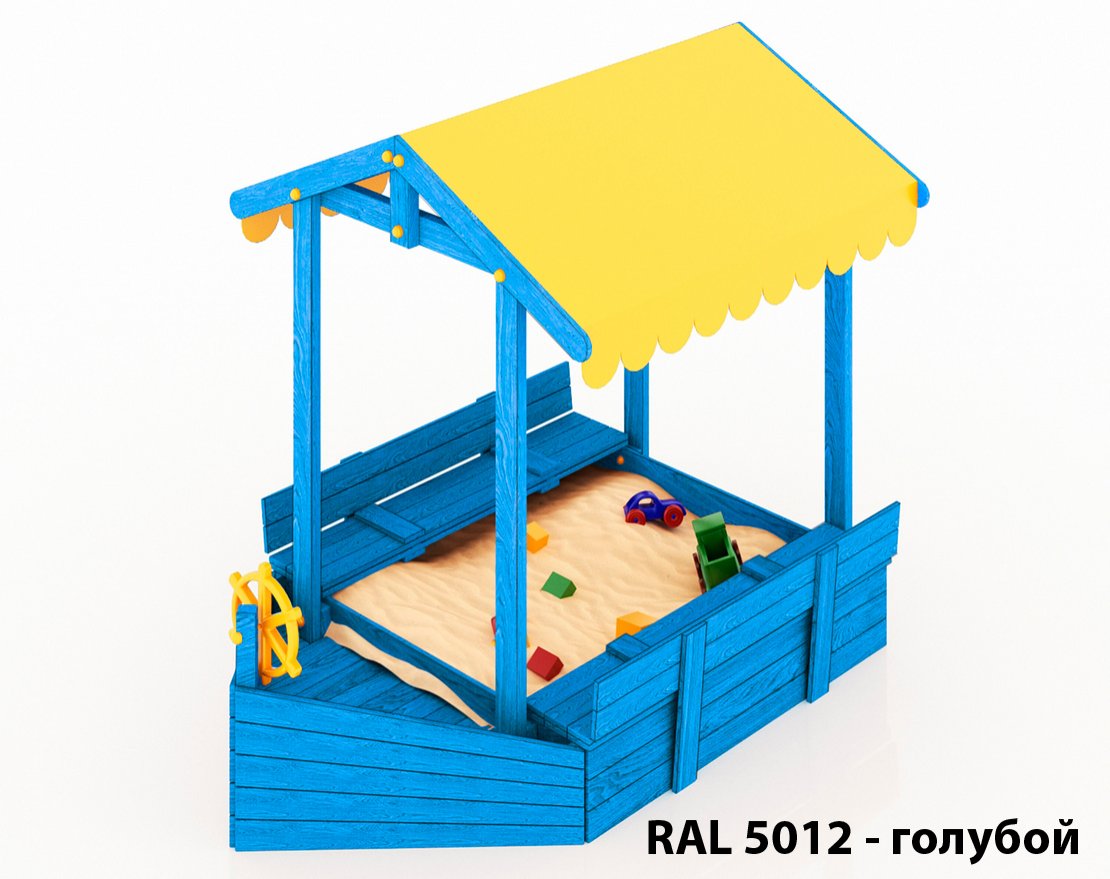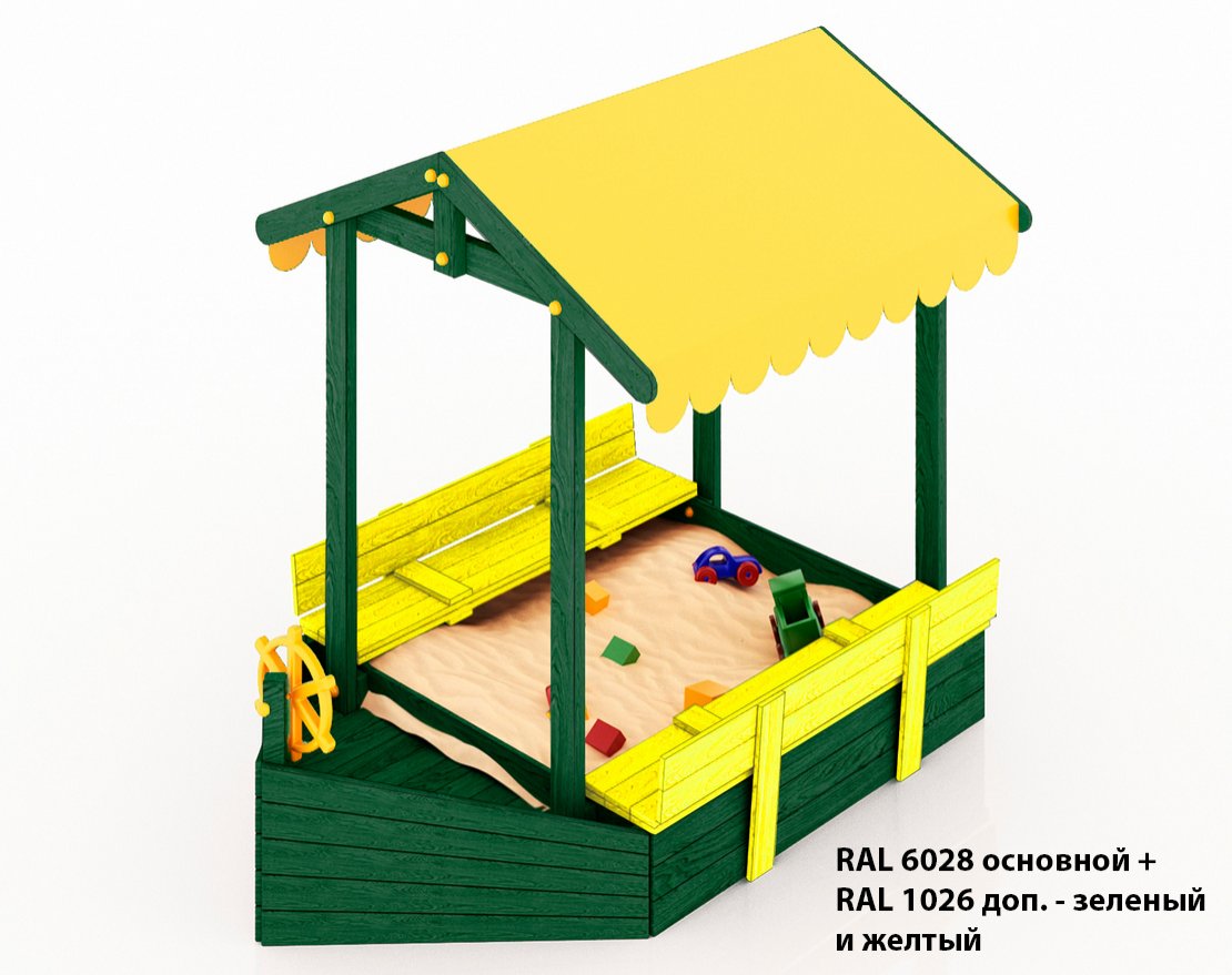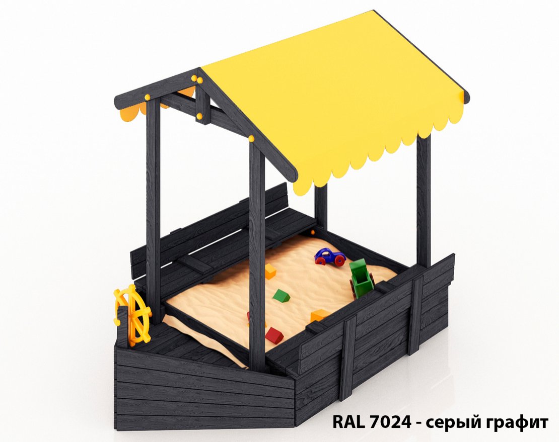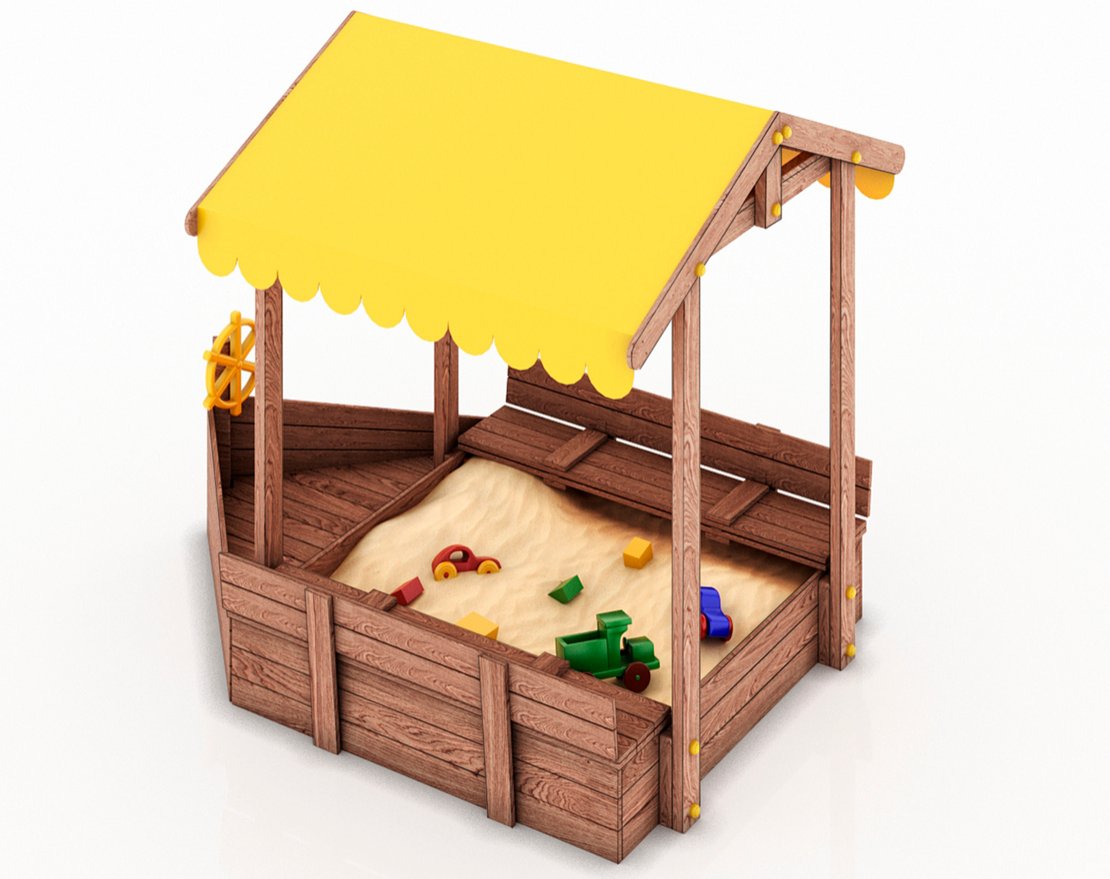 Детская складная песочница-кораблик с крышей, скамейками-лавочками и со штурвалом.