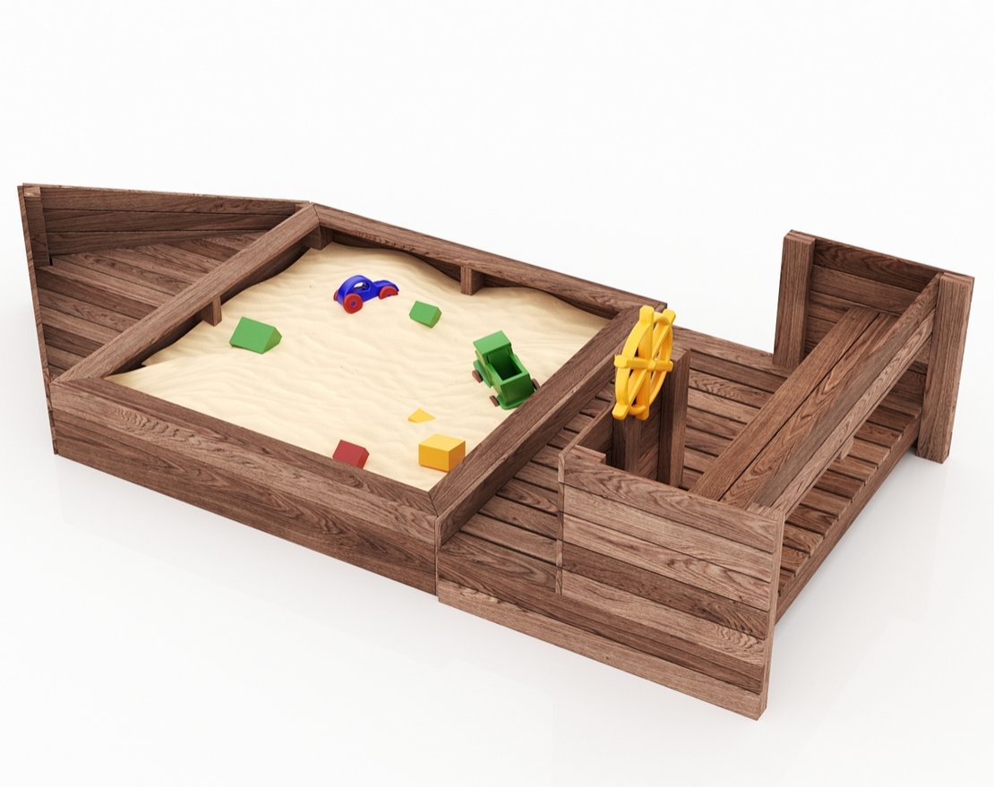 Детская песочница-кораблик и штурманская рубка со штурвалом.