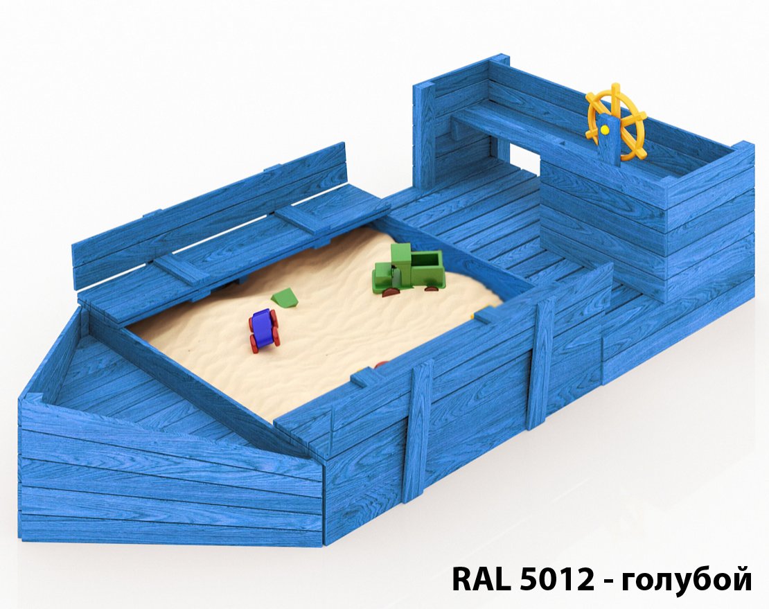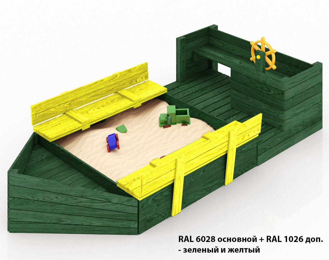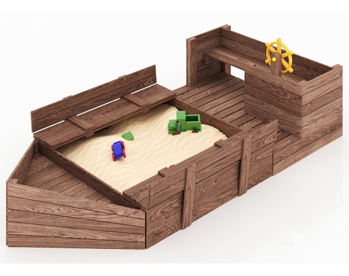 Детская песочница-кораблик и штурманская рубка со штурвалом.