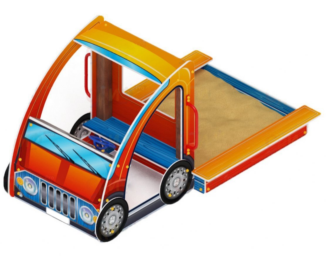 Выполнены из влагостойкой фанеры толщиной не менее 21 мм, кромки фанеры тщательно шлифованы. Борта песочницы: 1220х200 мм – 4 шт., окрашены в красный и синий цвет. Борта стилизованные под грузовичок выполнены из фанеры толщиной не менее 18 мм: 1300х1150 мм – 2 шт, 100х350 мм – 1 шт, 1000х1200 мм -1шт, 1000х400 мм – 1 шт. Все элементы окрашены с нанесением рисунка.