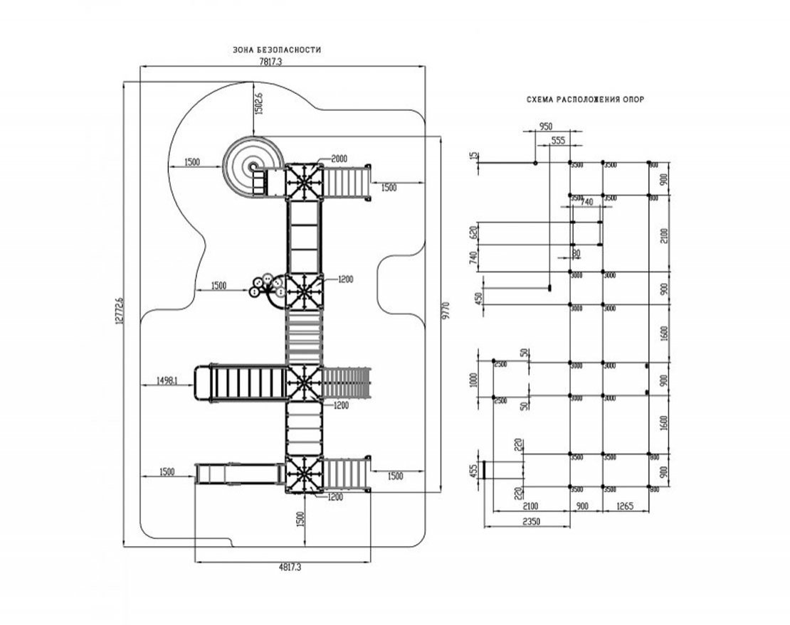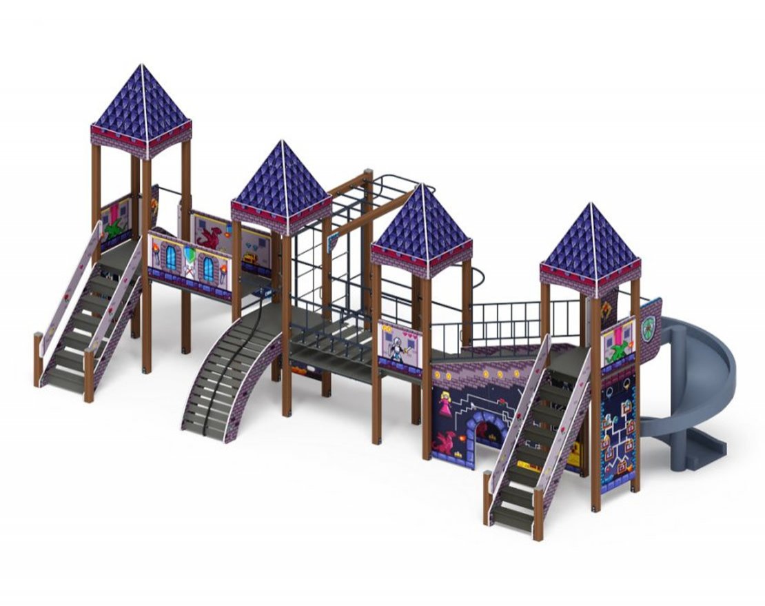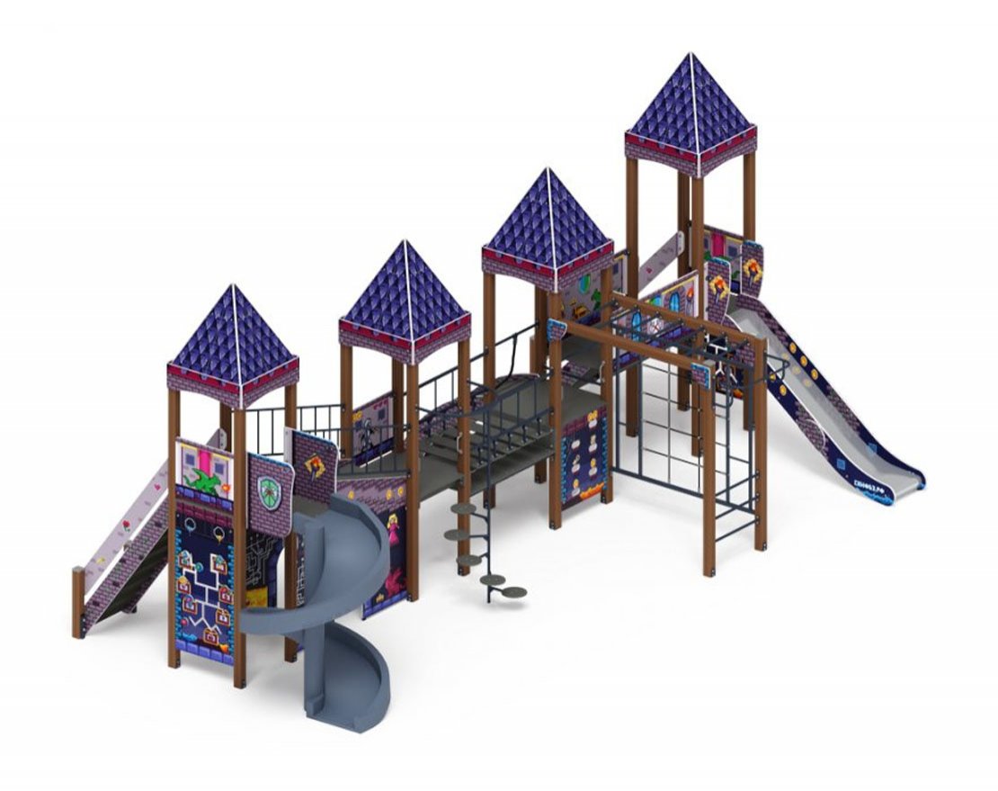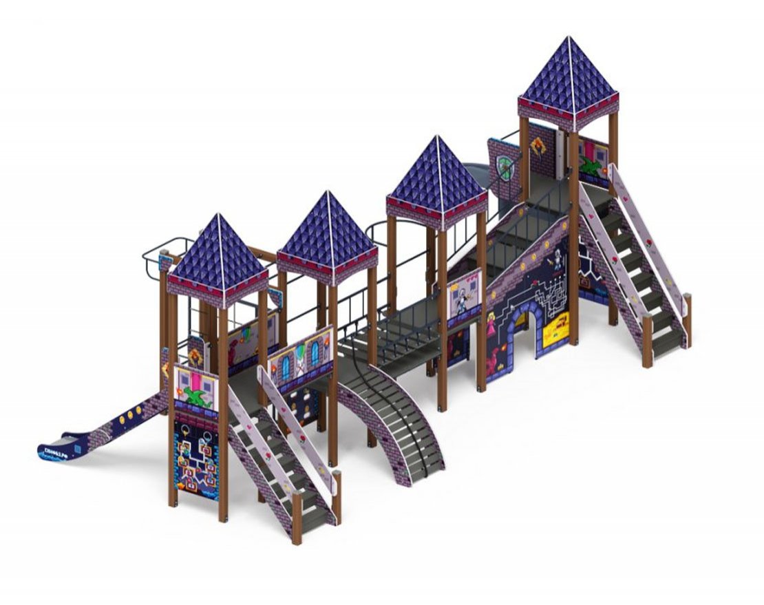 Выполнена из четырёх клеёных брусьев, окрашенных в коричневый цвет, 100х100мм, две башни высота (бруса) 3500 мм; и две башни высота (бруса) 3000 мм, пол из ламинированной фанеры, с анти-скользящим покрытием 1000х1000 мм толщиной 18 мм; Над башнями имеется четырехскатная крыша. Купол крыши выполнен из влагостойкой фанеры толщиной 12 мм, купол состоит из 8 элементов габаритом 1070х490х12мм. Купол поставляется в собранном виде. Крыши дополняются четырьмя декоративными арками, из влагостойкой фанеры толщиной 18 мм. Арки расположены по верхнему уровню опорных брусьев. Арки имеют габарит 1000х290х18 мм. Купол поставляется в сборе. Отметка пола от планировочной отм площадки 1200 мм башни с шестом, башня со стальной горкой 1500 мм, башня с винтовой горкой 2000 мм.