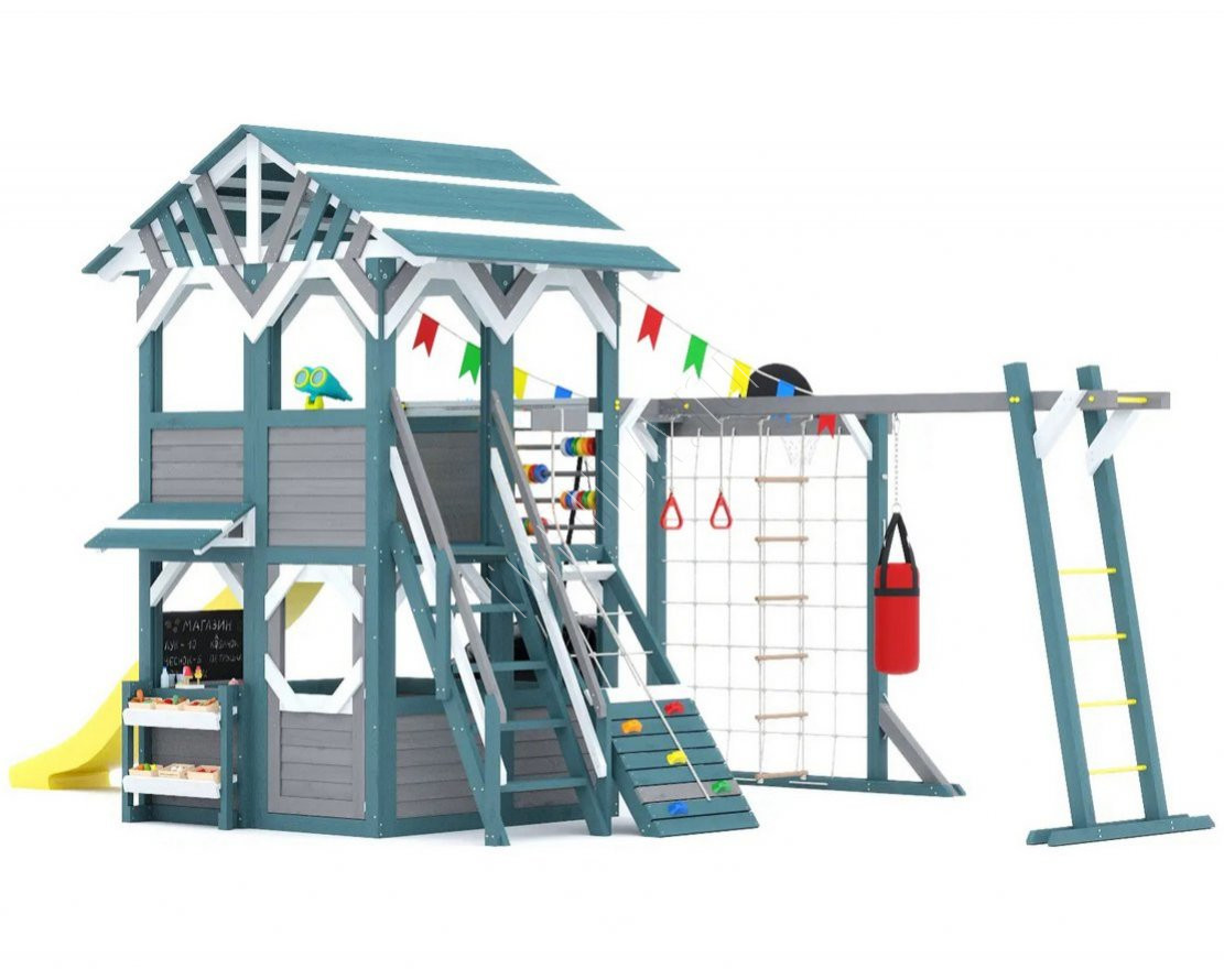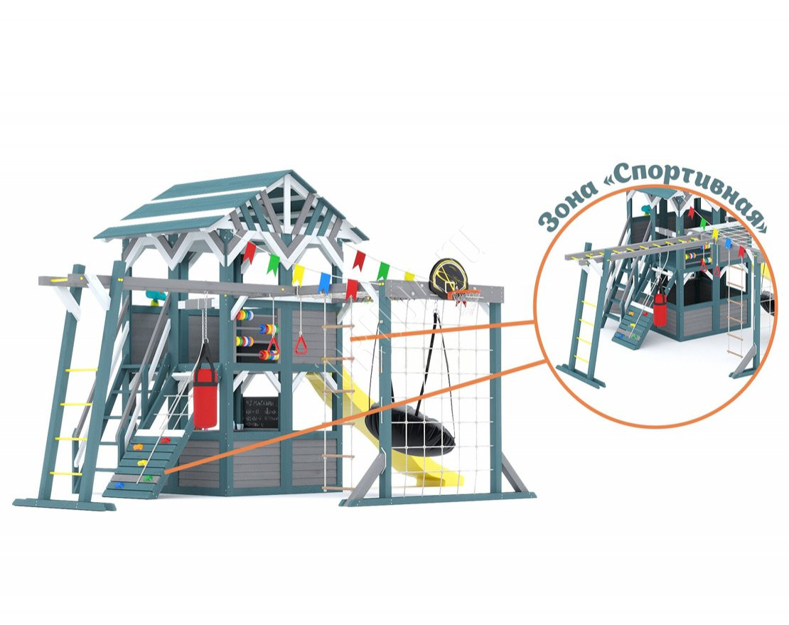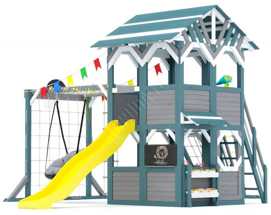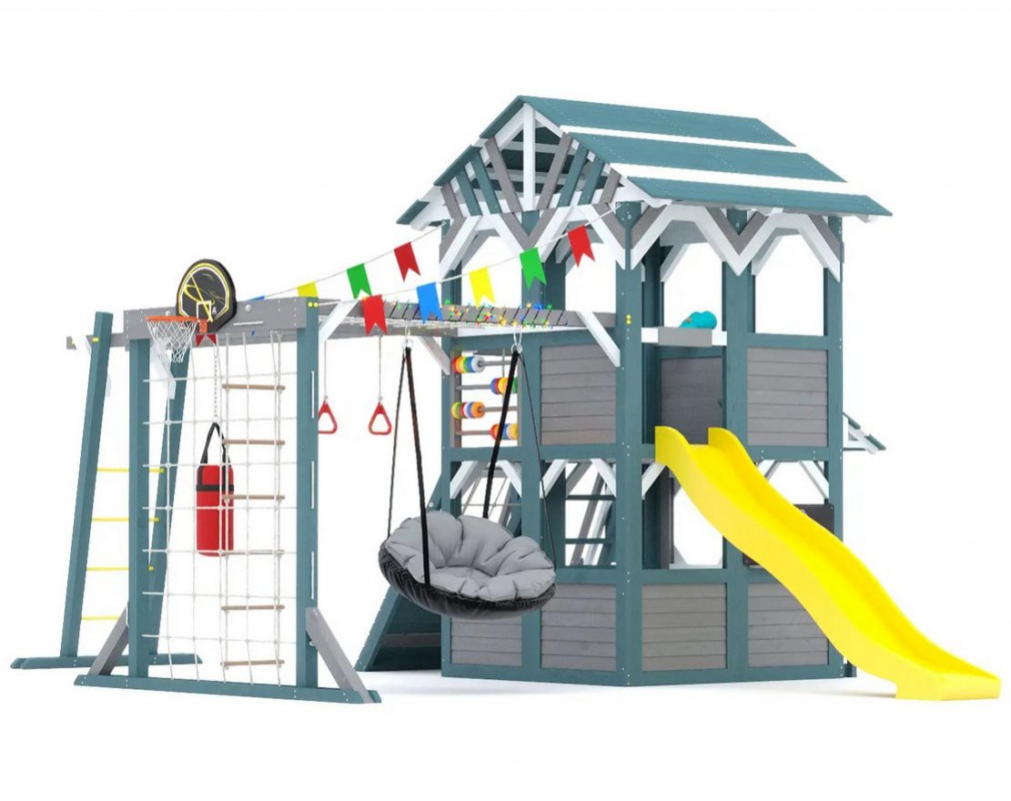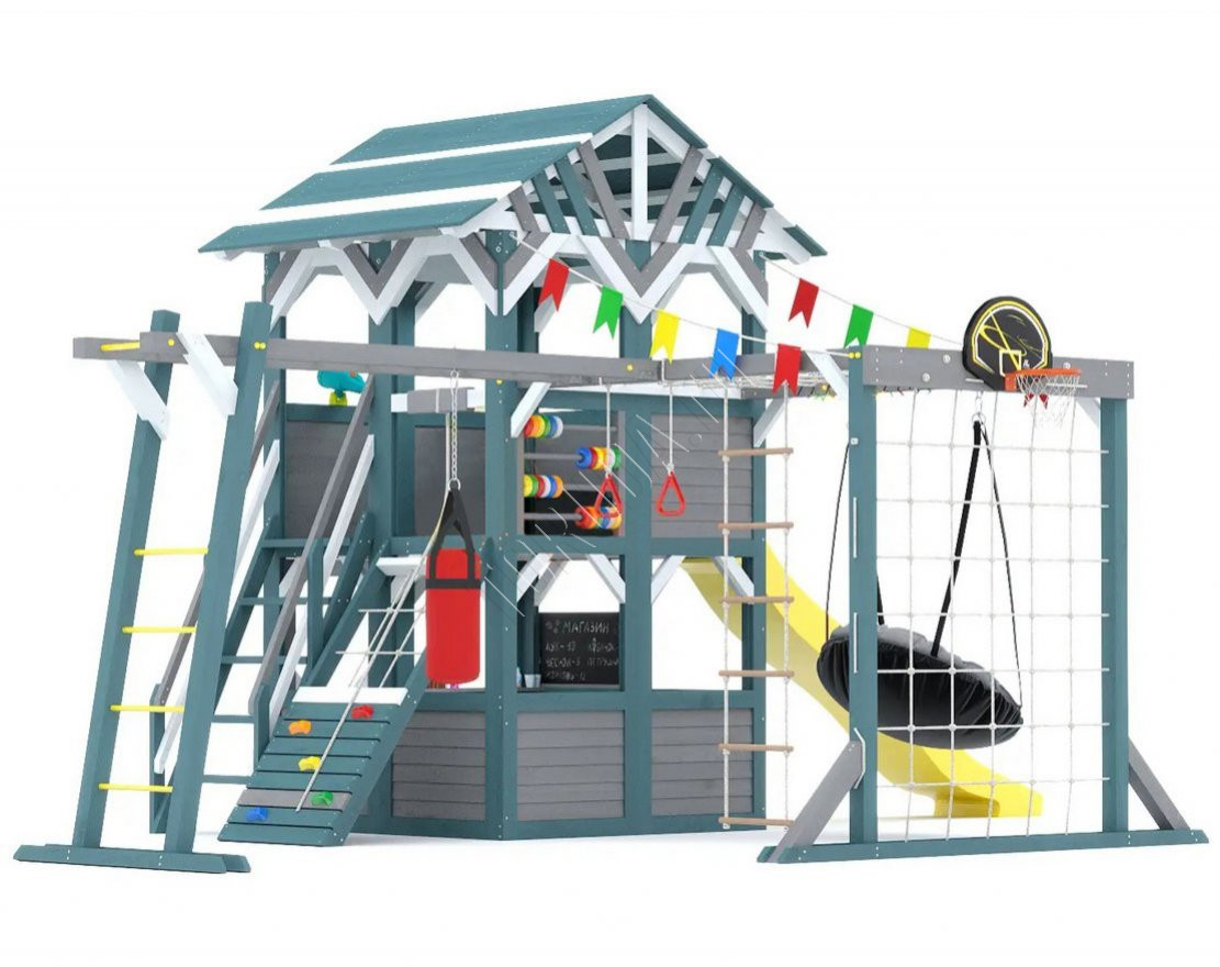 Этот комплекс сочетает в себе игровую и спортивную площадку, а также уютный детский домик с просторным игровым пространством. Он открывает двери в мир сказочных приключений для детей разного возраста (от 3 до 16 лет), развивая их физические способности и воображение.