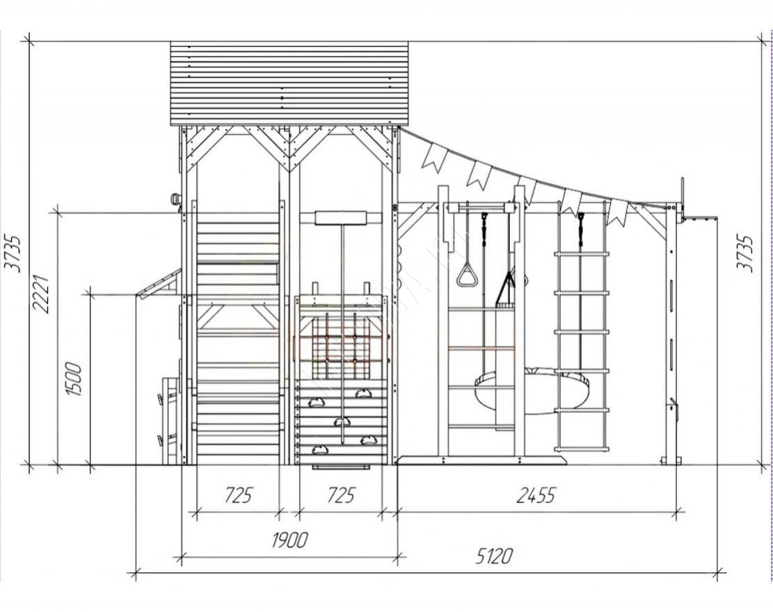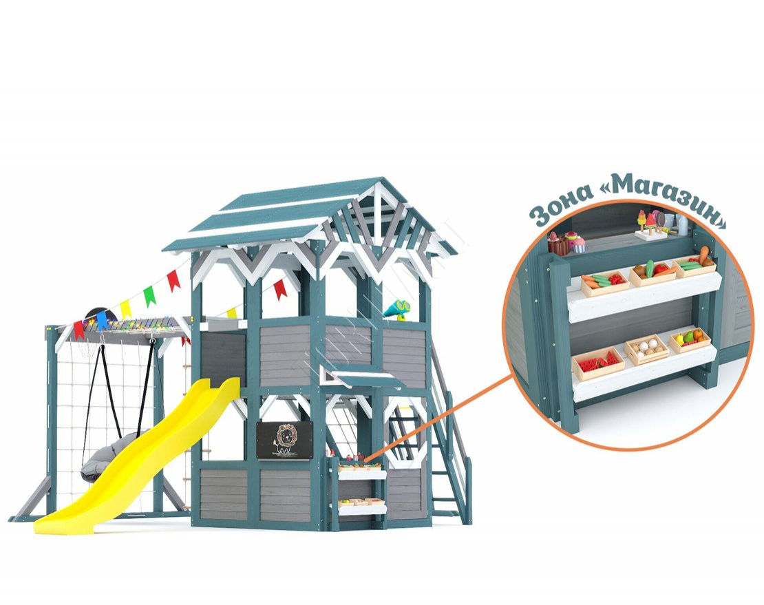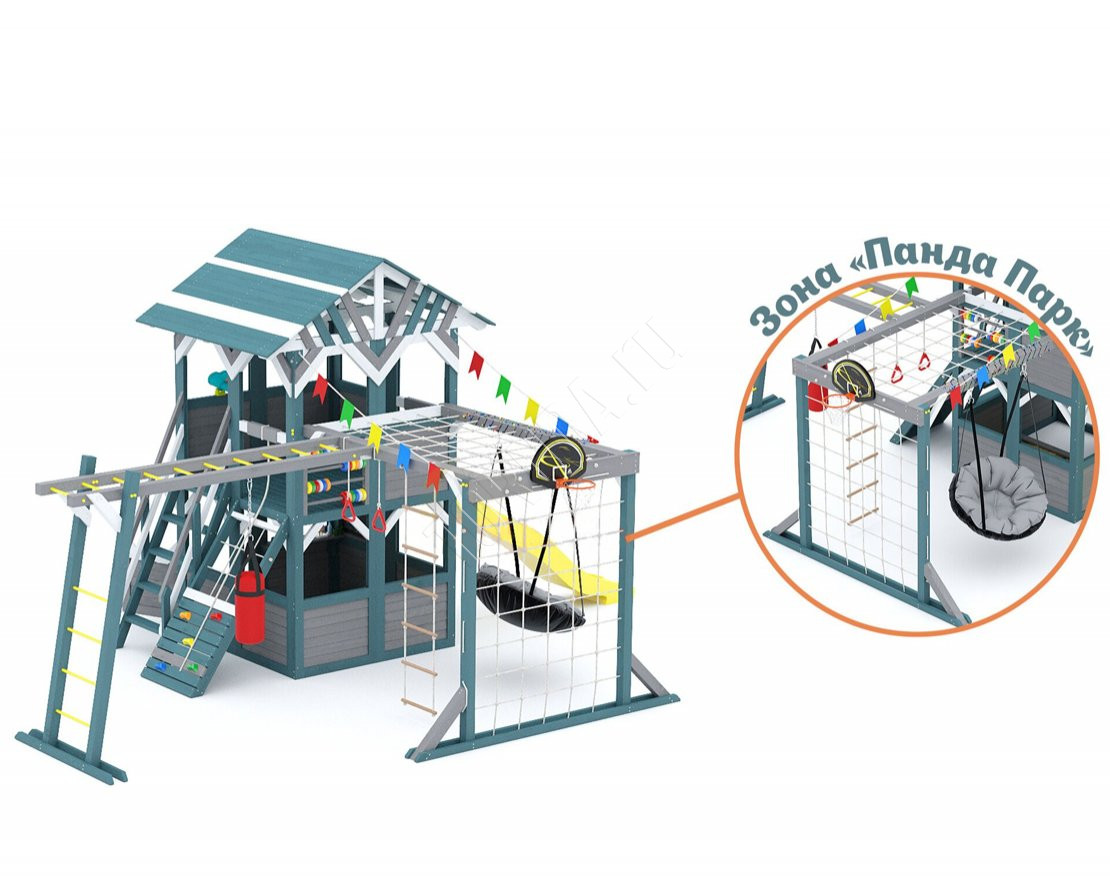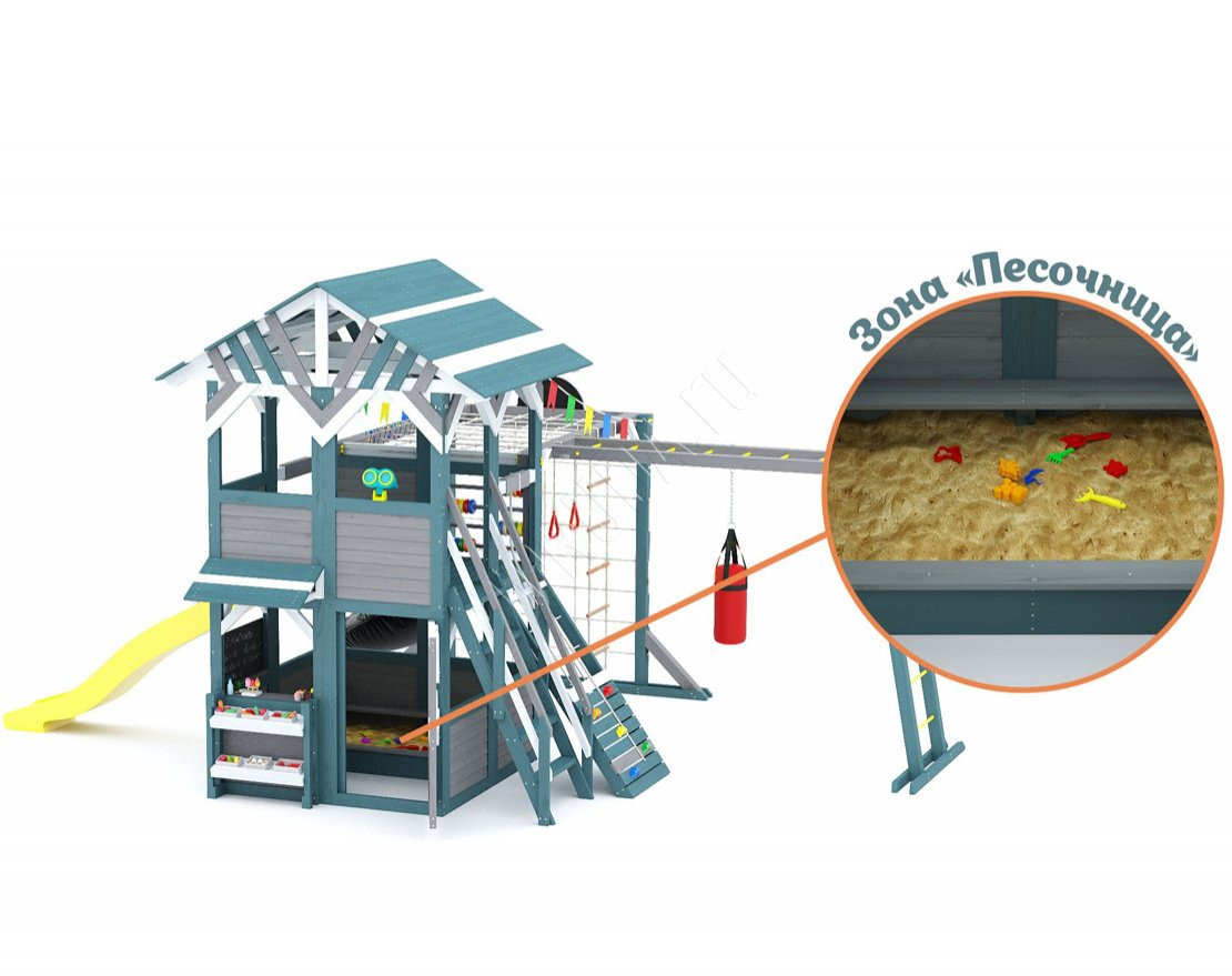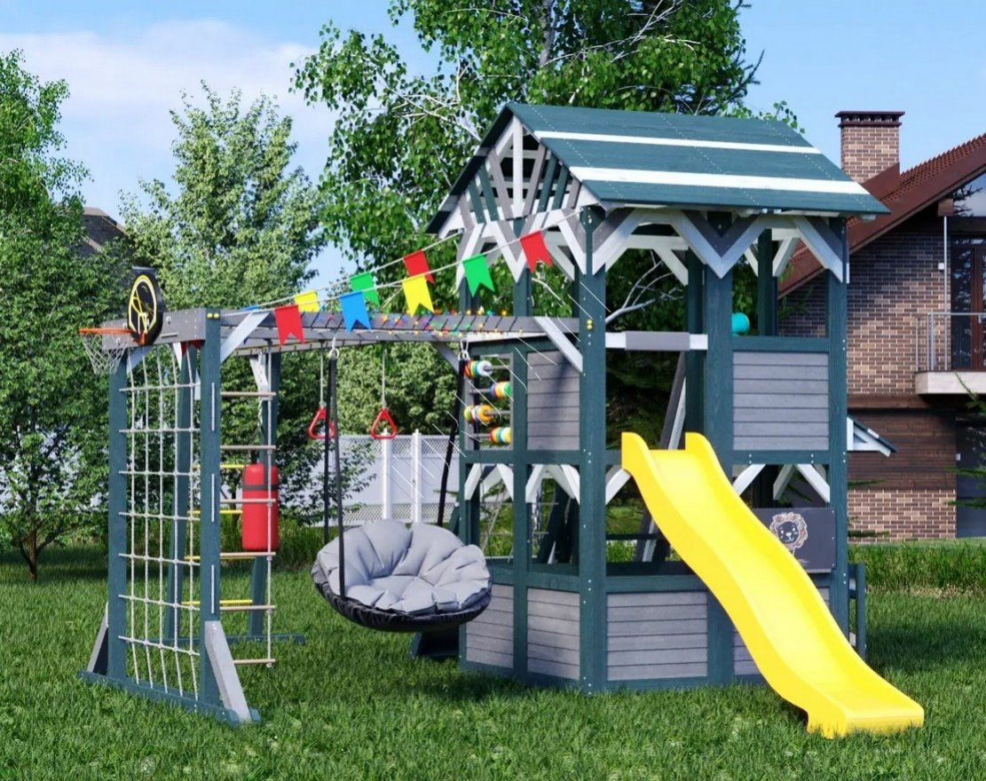 Этот комплекс сочетает в себе игровую и спортивную площадку, а также уютный детский домик с просторным игровым пространством. Он открывает двери в мир сказочных приключений для детей разного возраста (от 3 до 16 лет), развивая их физические способности и воображение.