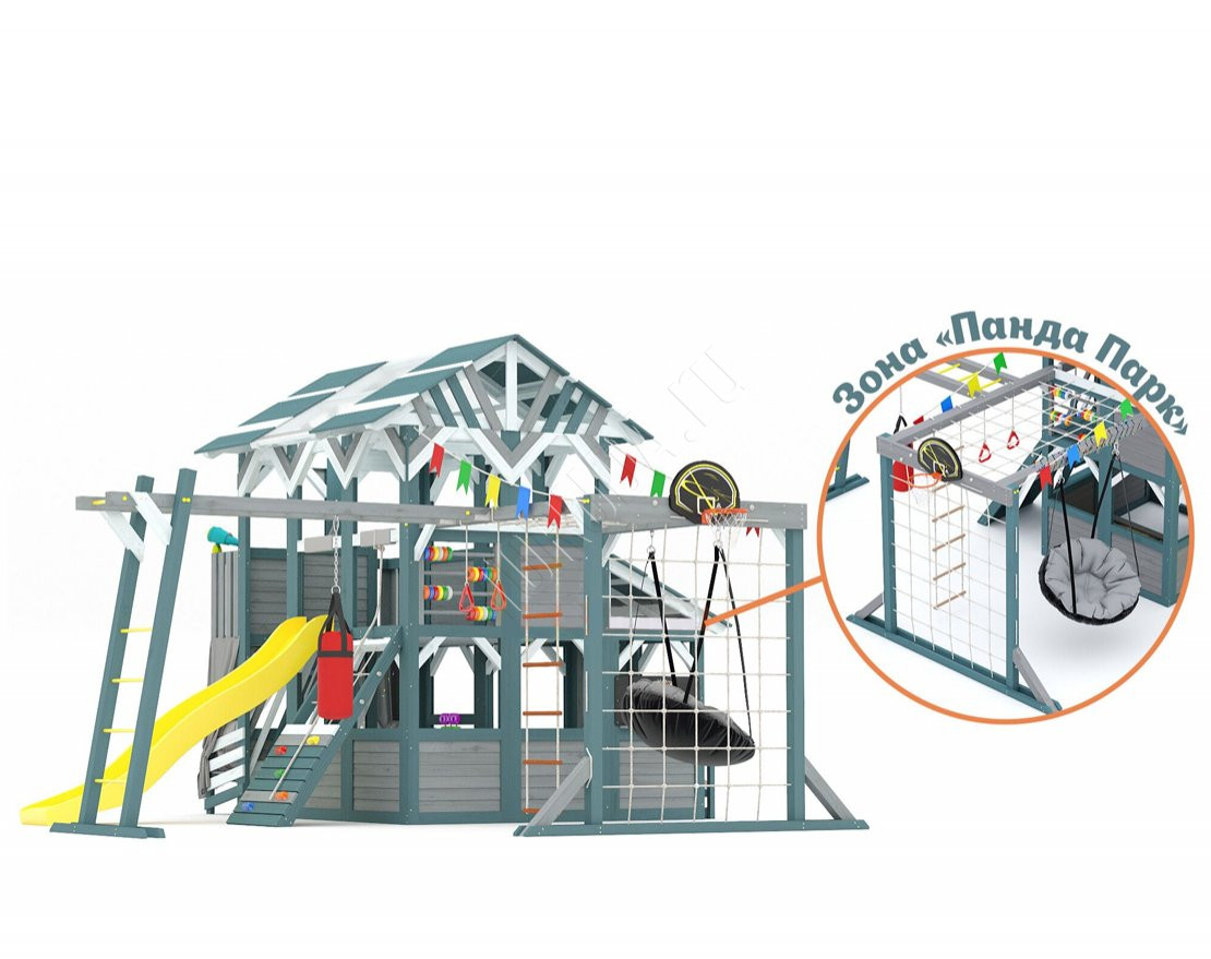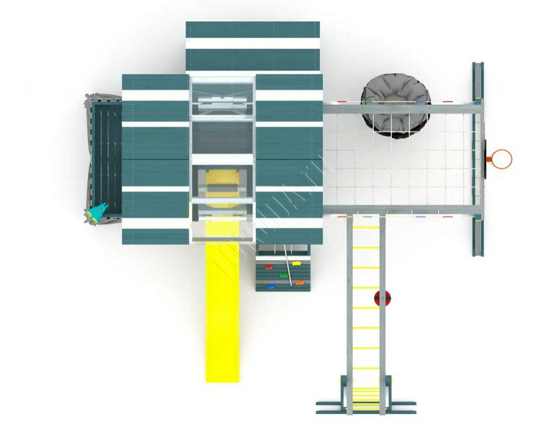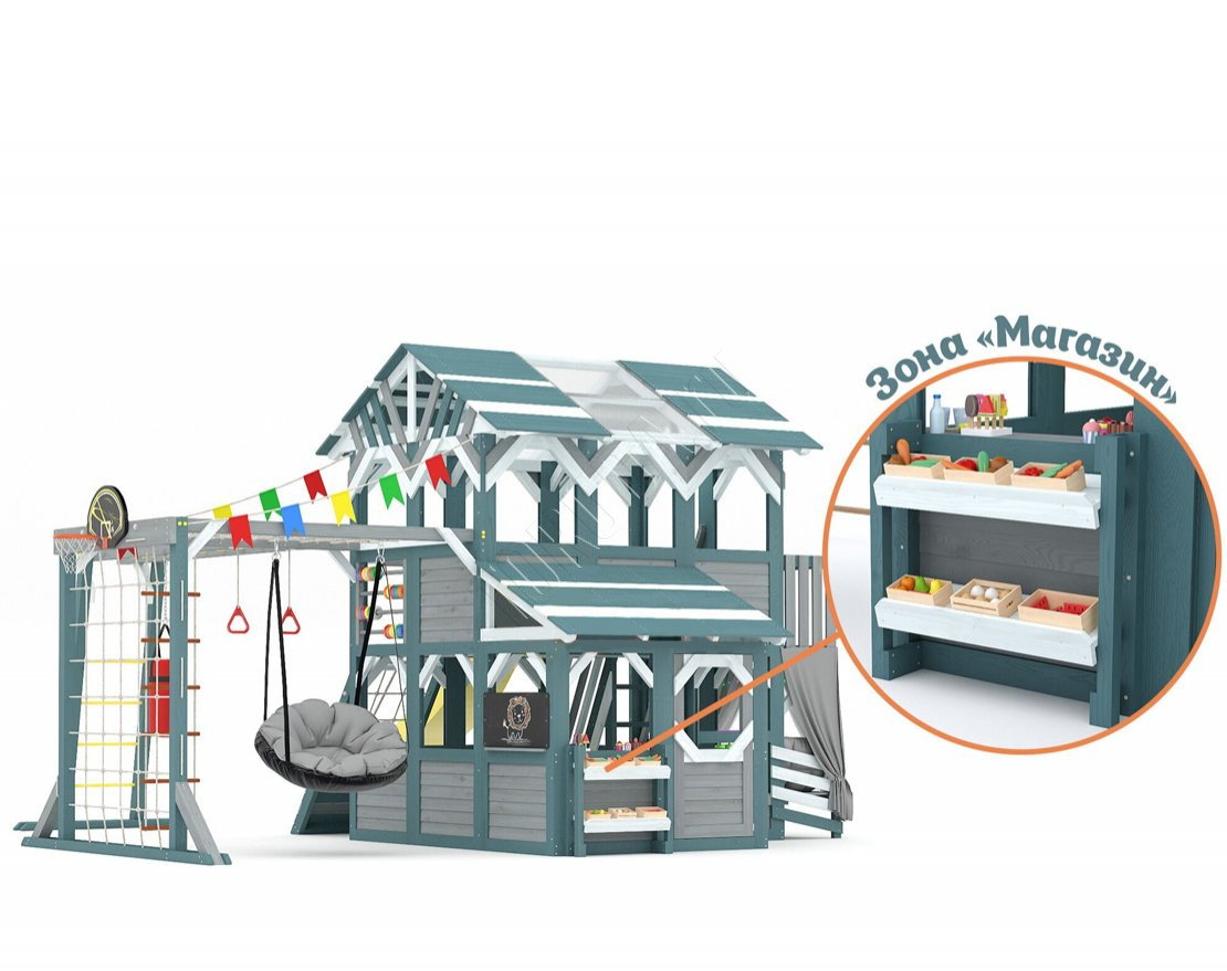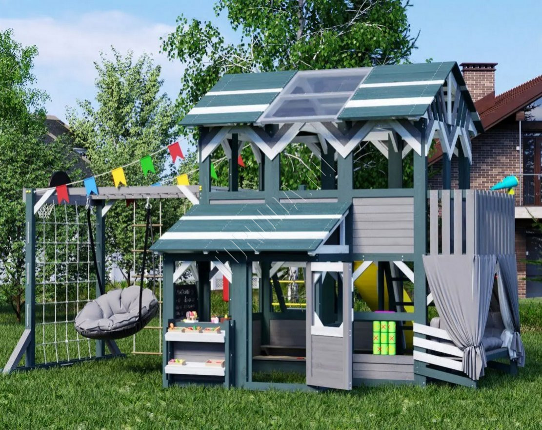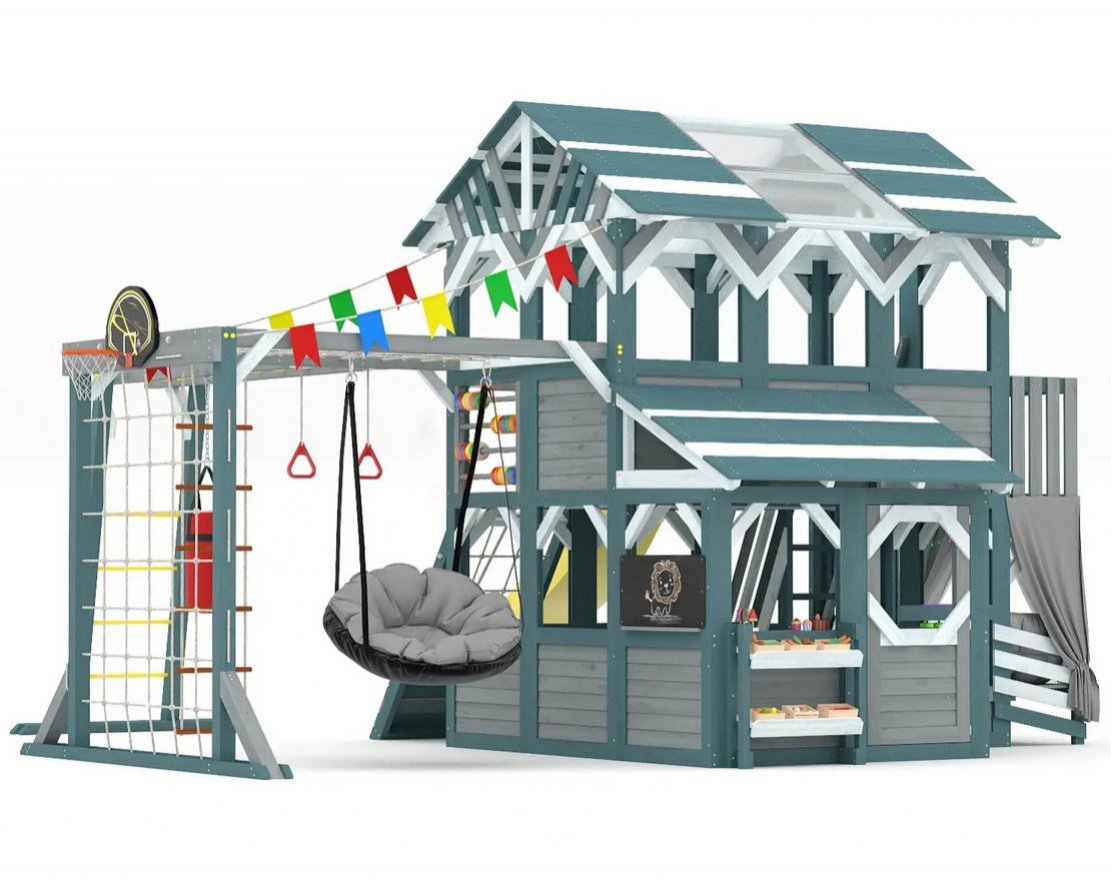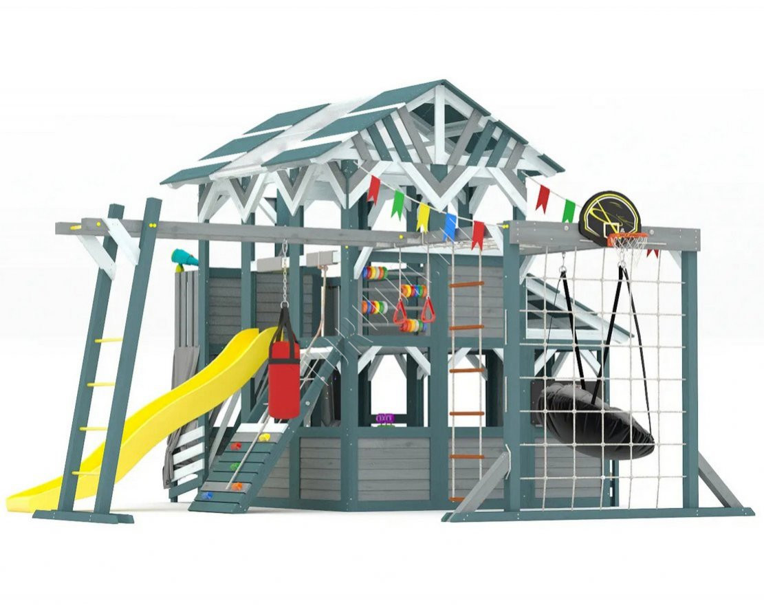 Этот комплекс сочетает в себе игровую и спортивную площадку, а также уютный детский домик с просторным игровым пространством. Он открывает двери в мир сказочных приключений для детей разного возраста (от 3 до 16 лет), развивая их физические способности и воображение.