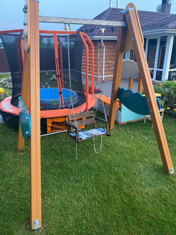 - Материалы: каждая деревянная деталь состоит из древесины сибирской лиственницы: доска – планкен сечением 90х20мм. (камерная сушка, влажность 8-16%). Обработана безопасным для детей покрытием в два слоя - восковой лазурью «ADLER» цвет «орех», со стороны торцов дополнительно запечатана мастикой. При желании, вы сможете самостоятельно обновлять покрытие деревянных элементов конструкции (при естественном износе покрытия, один раз в 2-3 года) или проводить реставрацию отдельных конструктивных элементов (при механическом повреждении), главное подобрать по цвету восковую лазурь или масло на водорастворимой основе, предназначенной для эксплуатации на улице.