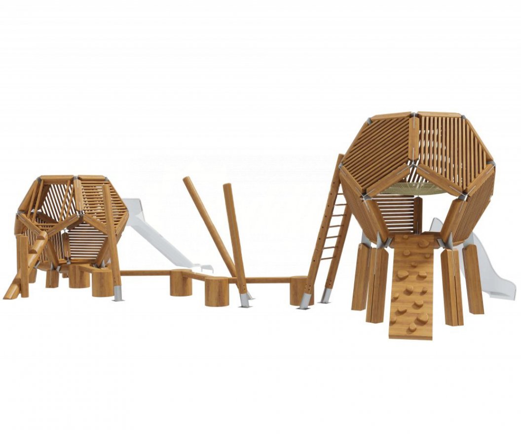 Основные элементы: игровые башни Д2700 и Д2400, прямые горки h1200 мм и h1500 мм, скалодром, лазательные элементы, гибкие лазательные элементы, стремянка.