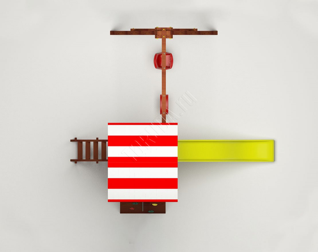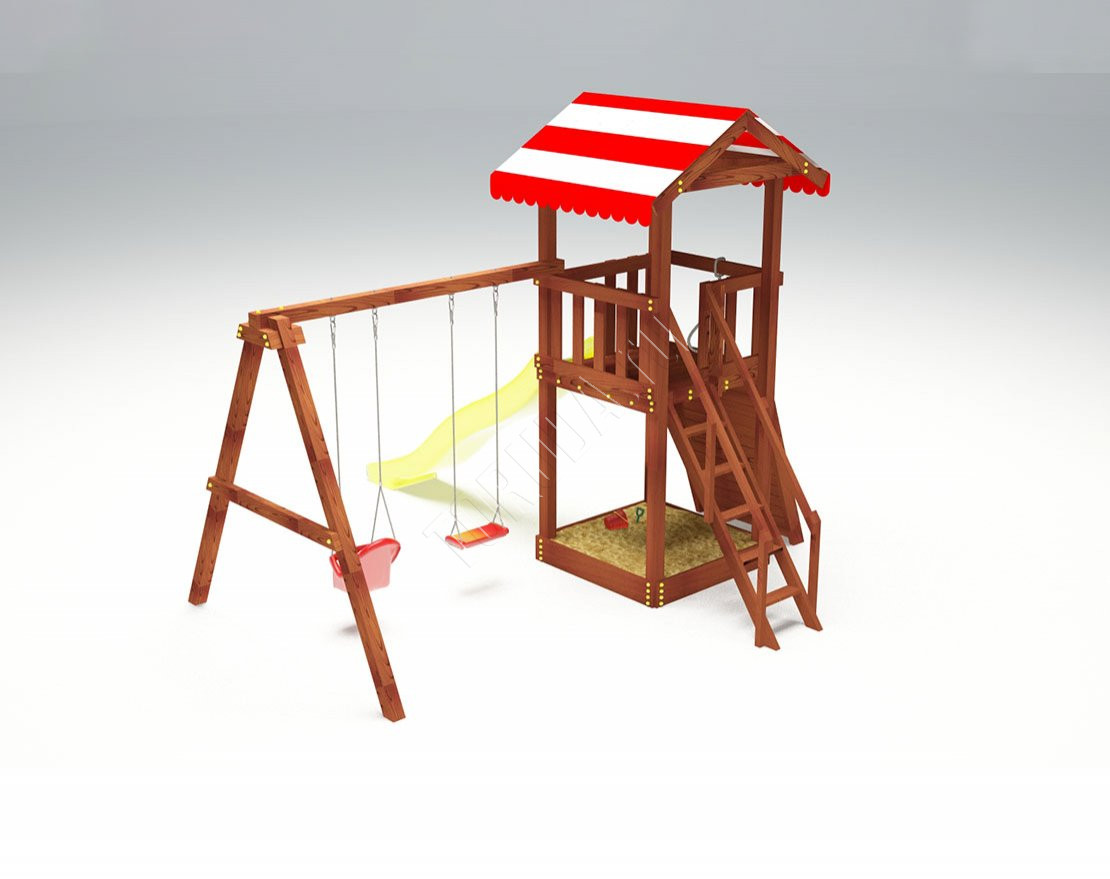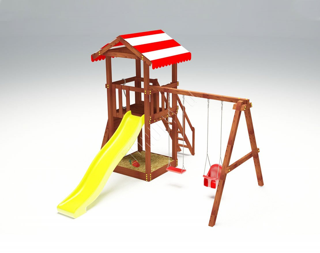 Комплекс имеет небольшие размеры и занимает минимум пространства. Большого выбора игрового оборудования тут нет. Однако это не способ экономии, а скорее формат, концепция позволяющая сделать площадку компактной. Каркас - деревянный. Положительно сказывается на сроке службы применение клееного бруса. Он не меняет форму с годами, не боится сырости или снега.