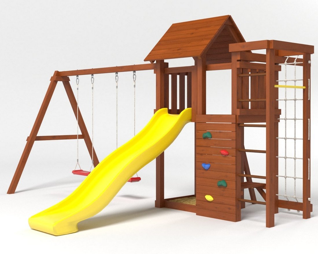 Это универсальное решение для активного досуга и позитивного настроения непосед с трех лет. Комплекс безопасен – конструкция, качество древесины и подвижных элементов соответствуют ГОСТ. Основным материалом является экологичный клееный брус, балки которого отшлифованы и имеют закругленные края.