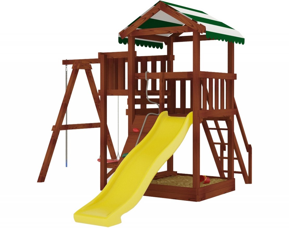 Также в модели есть еще один дополнительный канат для полноценного лазания – он расположен слева от качелей. Для любителей более спокойных игр предусмотрена песочница с удобной лавочкой для игральных принадлежностей.