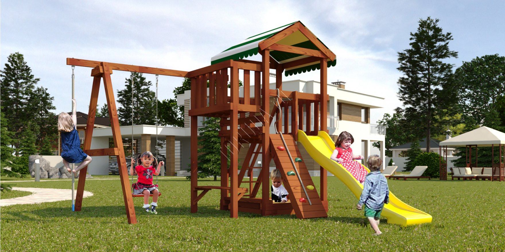 Детские игровые площадки серии Гарда – это лучший выбор для дач и домов с собственными участками. Площадки этой серии часто выбирают современные семьи, которые готовы собирать оборудование самостоятельно. Все модели серии изготовлены из современных экологичных материалов высокого качества. Они абсолютно безопасны (сертифицированы) для малышей любого возраста.