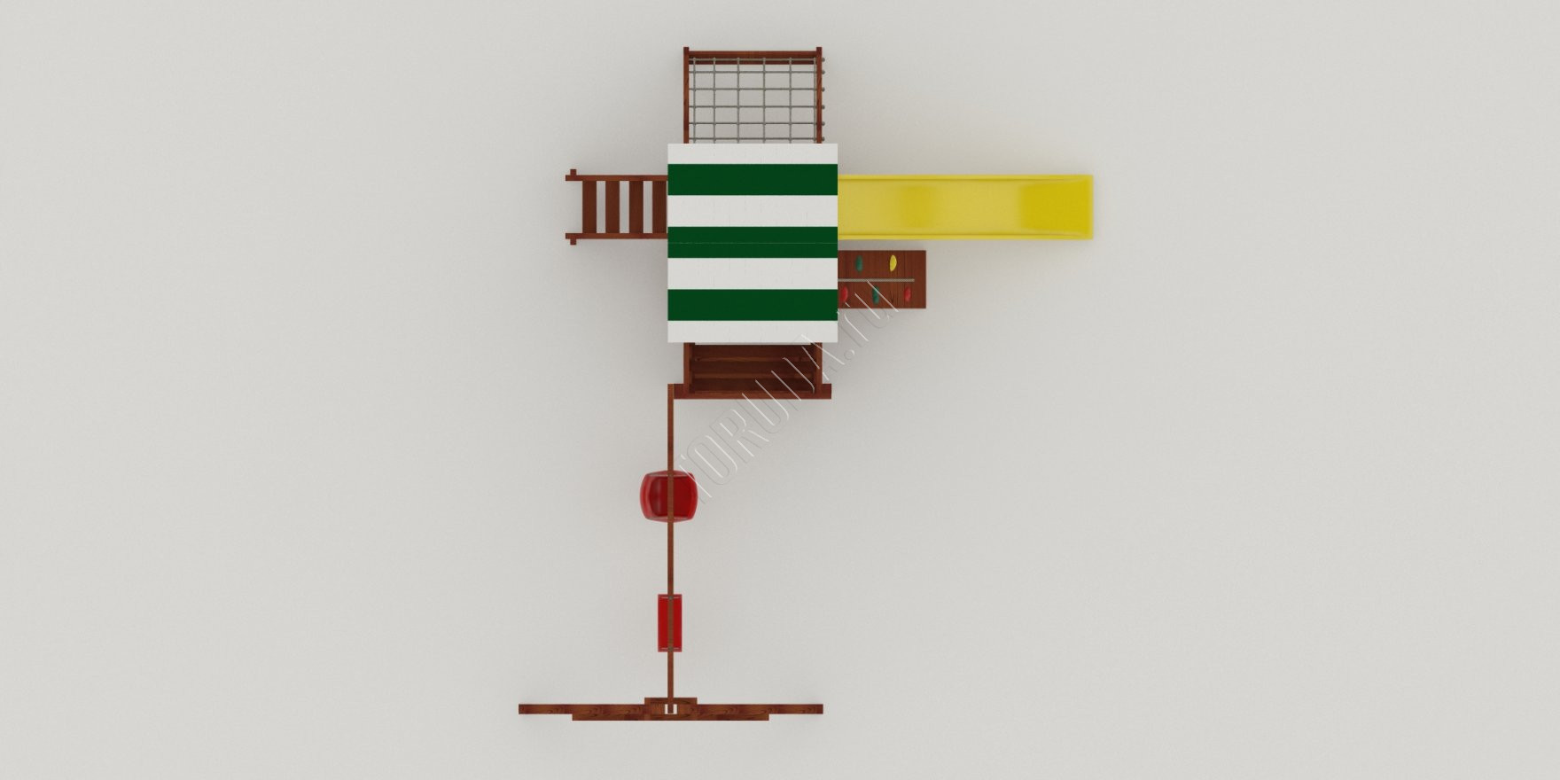 Центром площадки является игровая башня с высотой платформы 1200 мм и крышей, покрытой тканью или деревом. Забраться на башню можно несколькими способами: