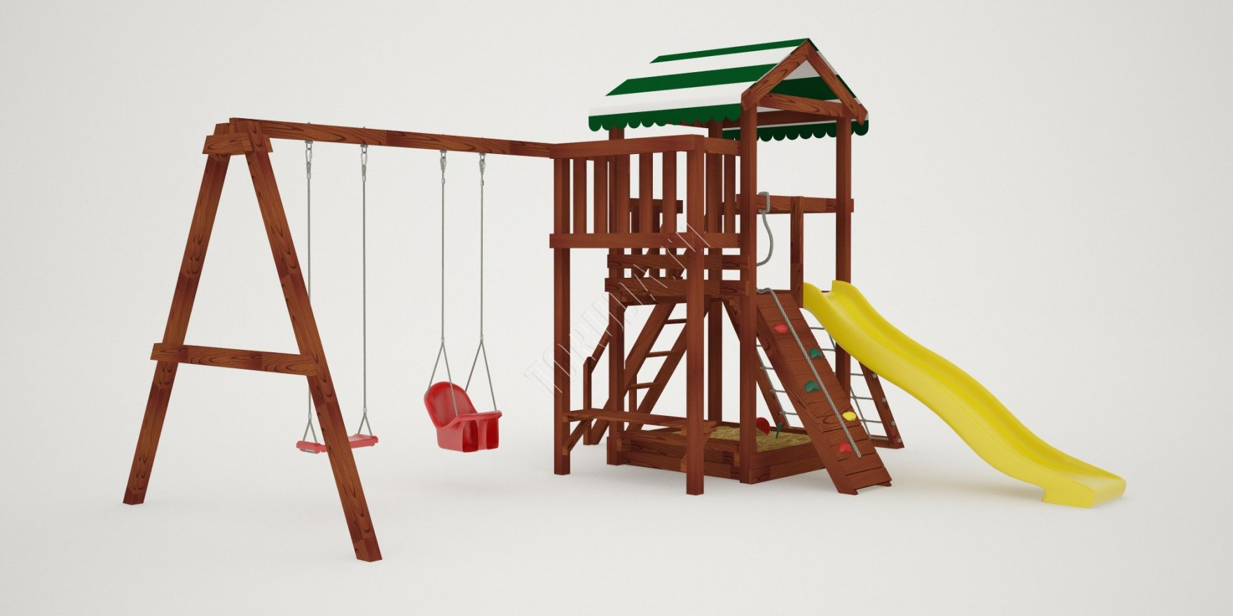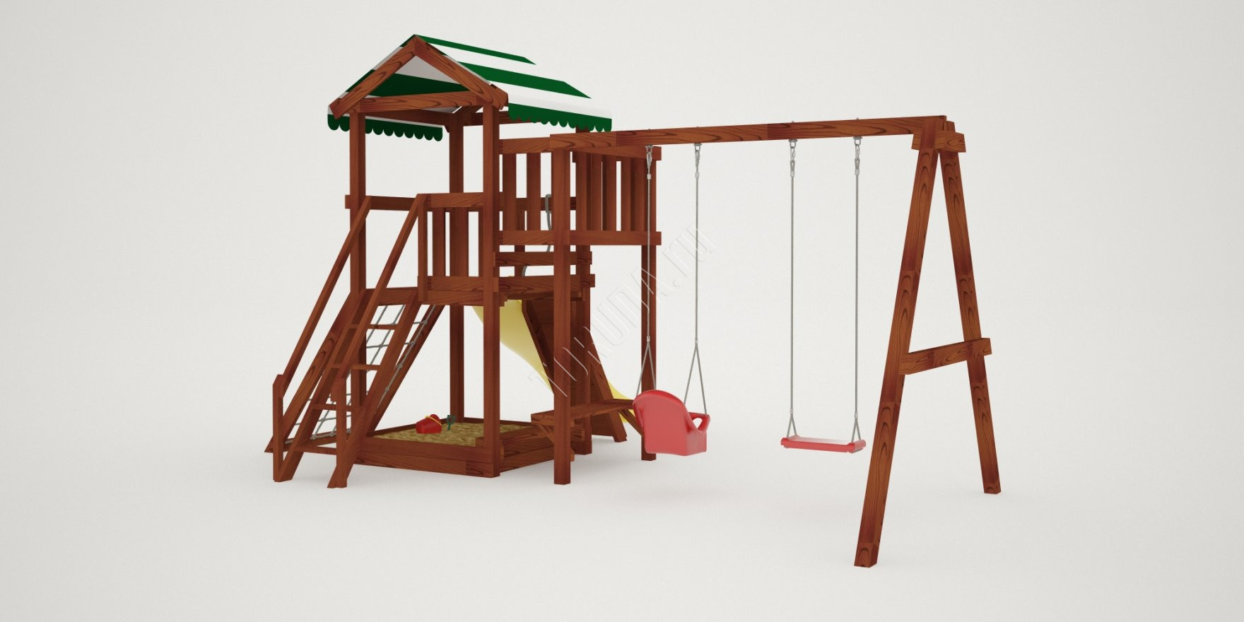 Поднявшись наверх можно поиграть на балкончике, с него будет открываться хороший вид на Ваш дачный участок. А быстро спуститься вниз малышам понравится с горки. Под платформой расположена квадратная песочница со сторонами 129 см, где можно более спокойно провести время, а отдохнуть на деревянной лавочке.