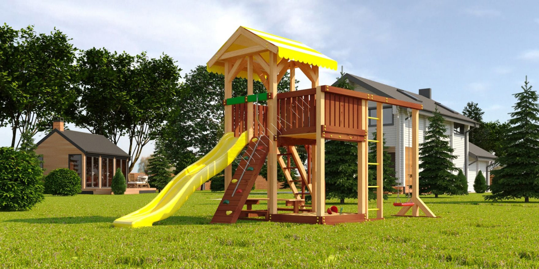 Альпинисты будут взбираться по скалодрому, использовать свисающий канат в помощь или нет, пусть выбирают сами, и наматывать круги по рукоходу. Моряки важно зайдут по лестнице с поручнями на самый верх башни и будут наблюдать за обстановкой в море, а потом молниеносно спустятся вниз с синей горки. Маугли или Тарзан ловко вскарабкаются по сетке-лазалке или шведской стенке, точно найдут клад в песочнице и поделят сокровища на лавочке рядом с ней. И что точно сделает каждый из героев – полетает на сказочных качелях, это одно из любимых детских развлечений.