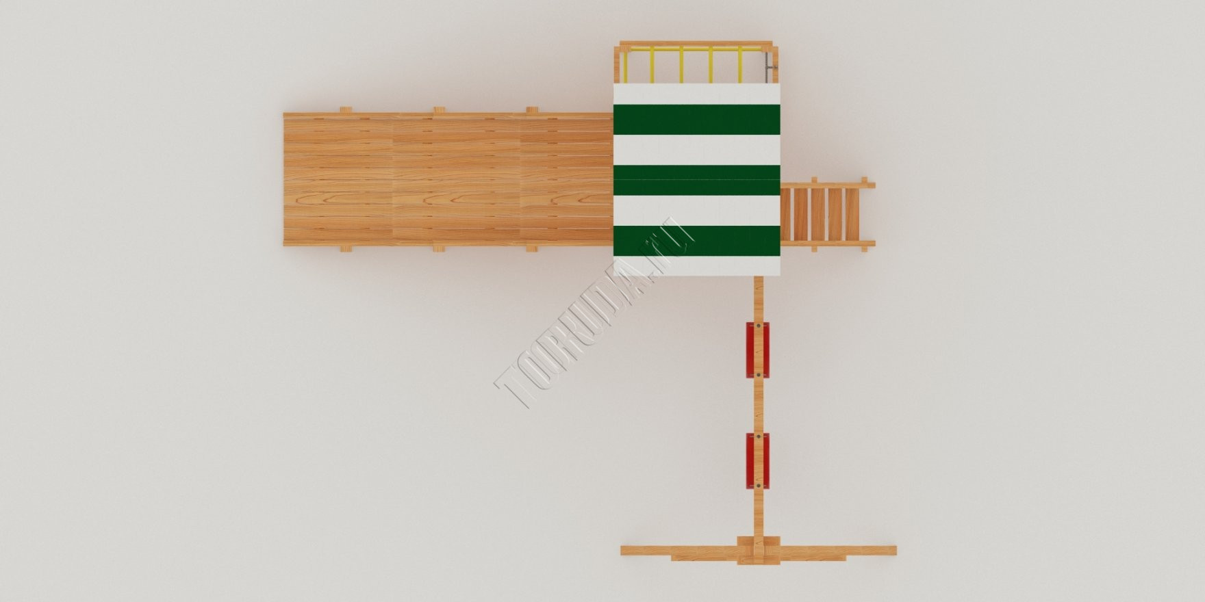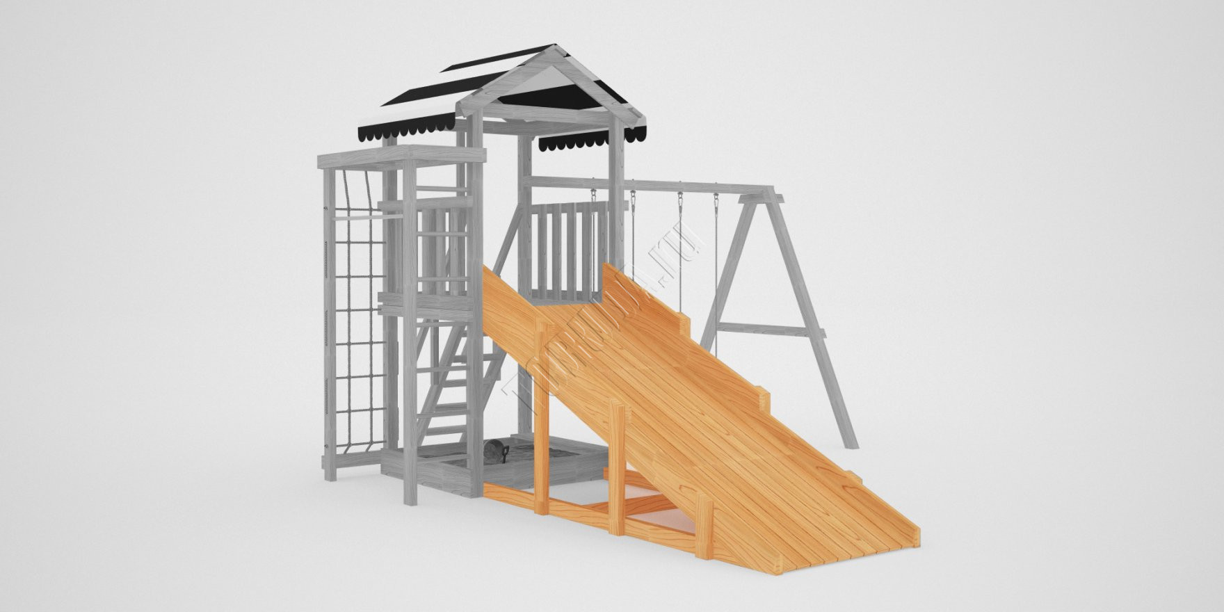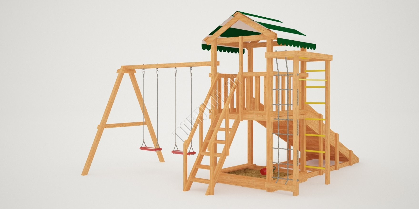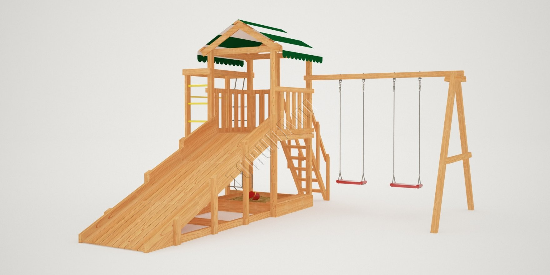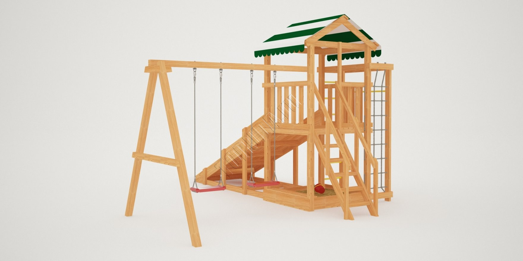 Конструкция, качество дерева и качельные подвесы соответствуют ГОСТ. Основной материал натуральный – это экологичный клееный брус, он гладкий на ощупь, его углы скруглены во избежание получения ссадин. Площадка полностью безопасна: все крепежи и болты плотно закрыты заглушками, а спортивное оборудование используется от проверенного сертифицированного бельгийского производителя.