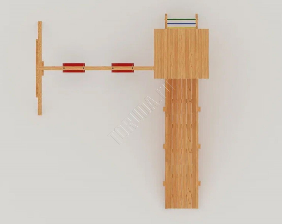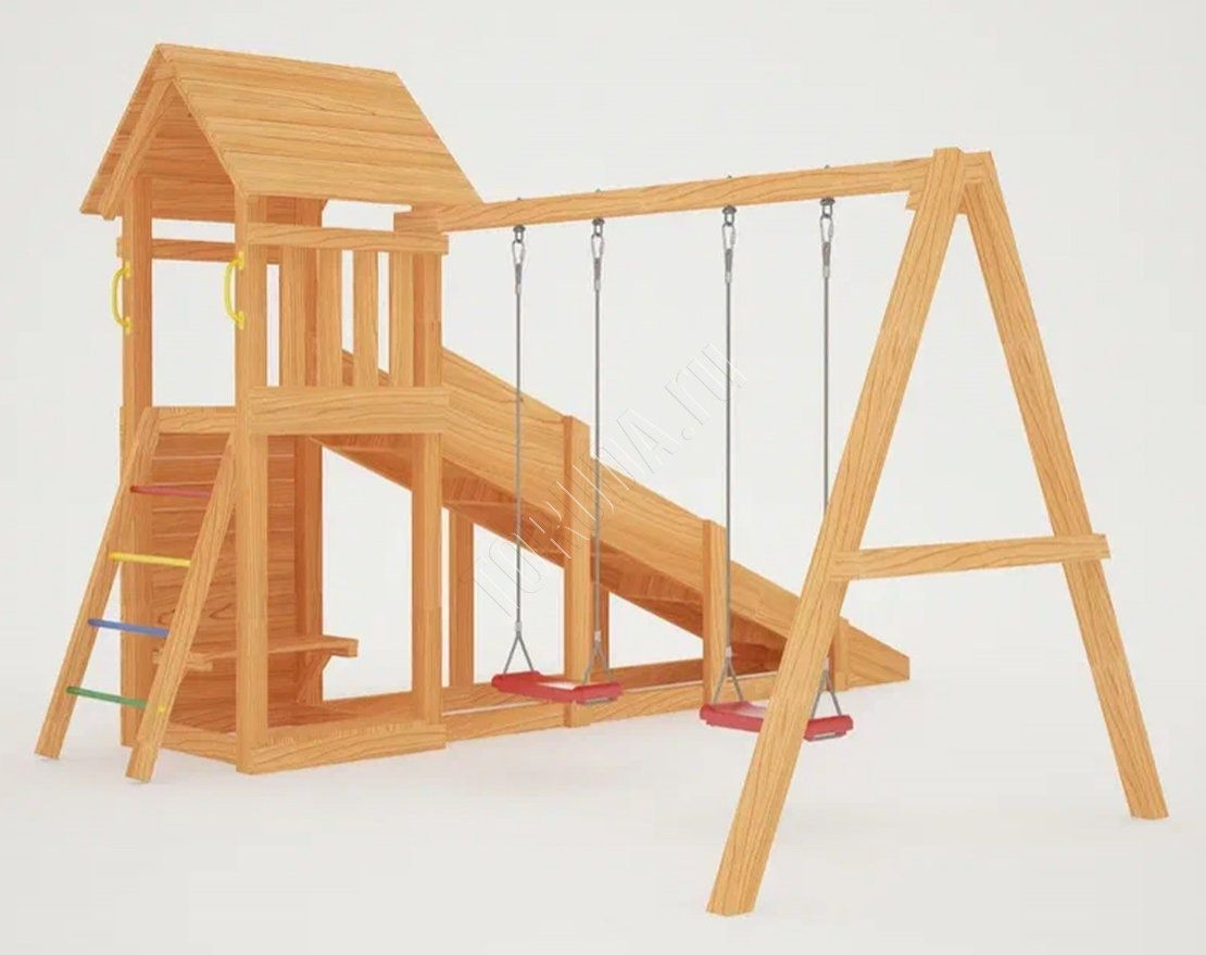 Основной материал натуральный и экологичный – это шлифованный клееный брус, края которого скруглены. Занозы и ссадины исключены. Детская площадка безопасна: конструкция рамы произведена согласно ГОСТ, все крепежи закрыты заглушками, а подвесное снаряжение сертифицировано и создано специально для детей в Бельгии.