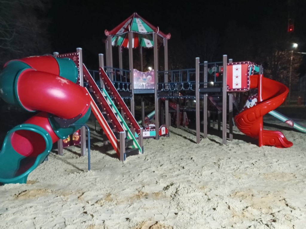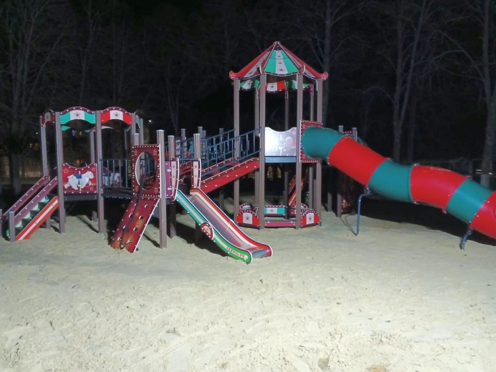 Под одной из восьмигранных башен расположена песочница. Борта и лавки выполнены из влагостойкой фанеры толщиной 18 мм, кромки фанеры тщательно шлифованы, окрашены с нанесением принта «Шапито».