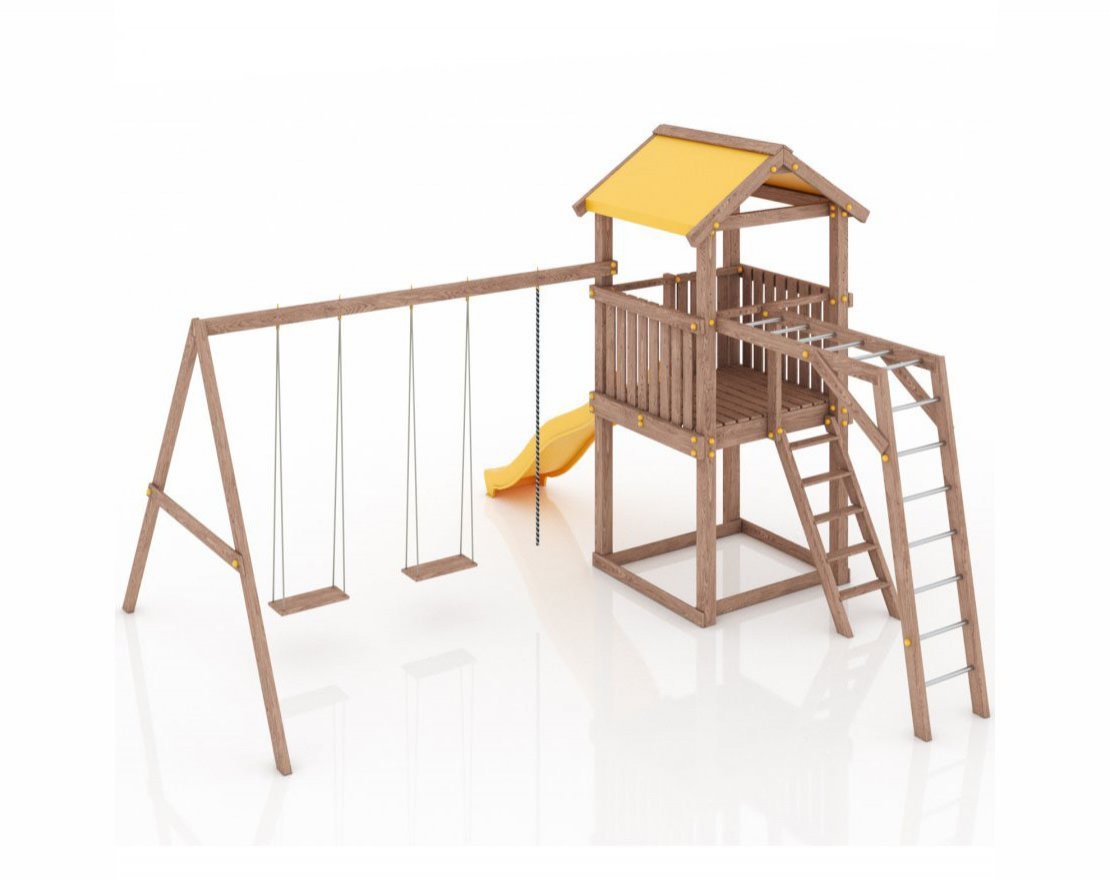 Детская площада изготовлена в соответствии с ГОСТ Р 52168-2012. Опоры и несущие элементы изделия изготовлены из клееного бруса карельской сосны 90х90 мм, доска 40х90мм, 40х140мм, другие перекрытия 20х90мм доска, ограждение и иные элементы из массива сосны. Везде используется сухая доска.