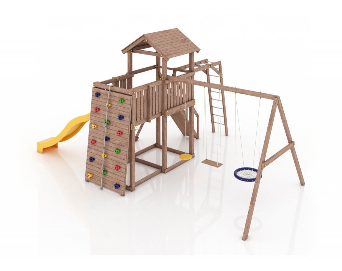Детская площадка изготовлены в соответствии с ГОСТ Р 52168-2012. Опоры и несущие элементы изделия изготовлены из клееного бруса карельской сосны 90х90 мм, доска 45х90мм, 45х140мм, другие перекрытия 20х90мм доска, ограждение и иные элементы из массива сосны. Везде используется сухая доска.