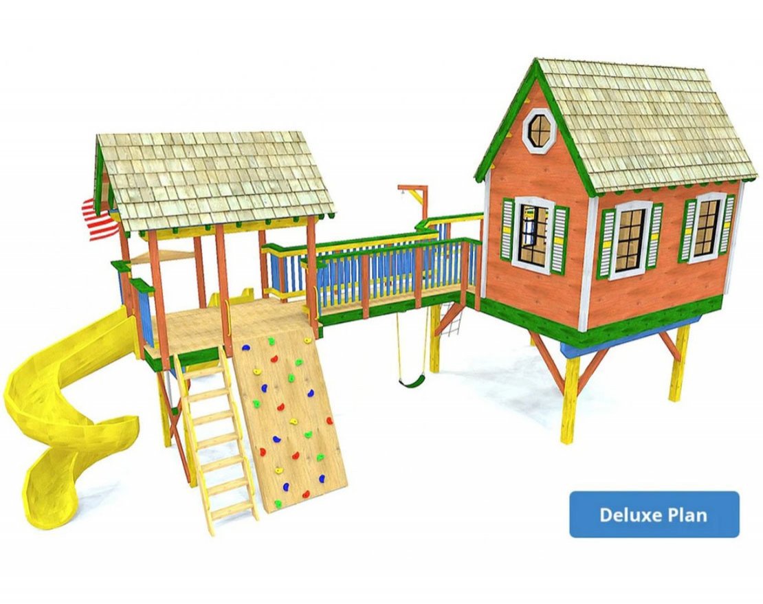 Этот игровой домик высотой 213 см предоставляет достаточно места для аксессуаров, игрового пространства, детских качелей. Большая открытая палуба даже позволит посадить дерево внутри детской площадки.