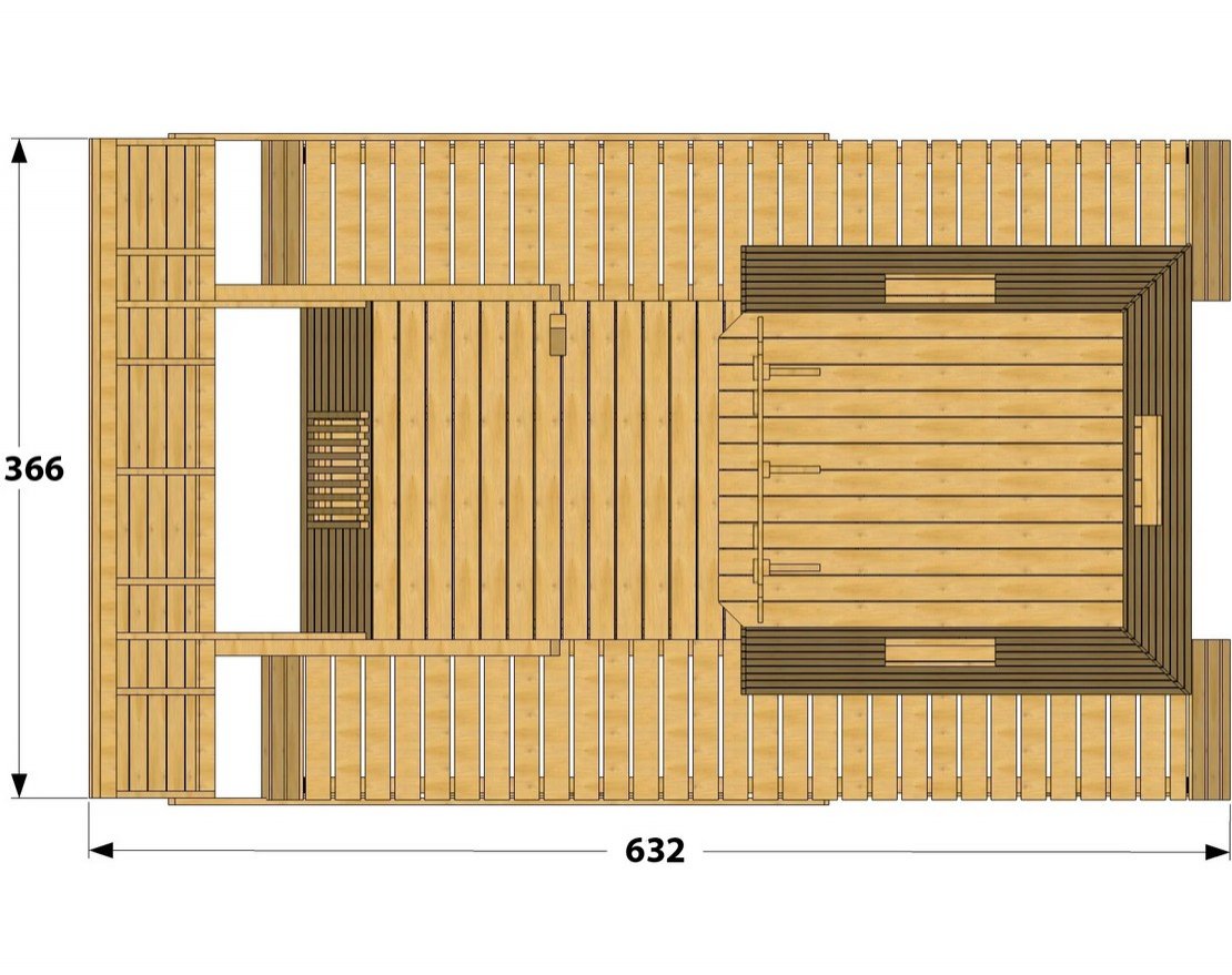 Каркас изделия изготовлен из сибирской лиственницы. Все элементы тщательно отшлифованы и покрыты двумя слоями немецкой краски Biofa. Для крепления элементов используется уникальная скрытая система монтажа Camo, которая делает поверхность полностью безопасной и эстетичной.