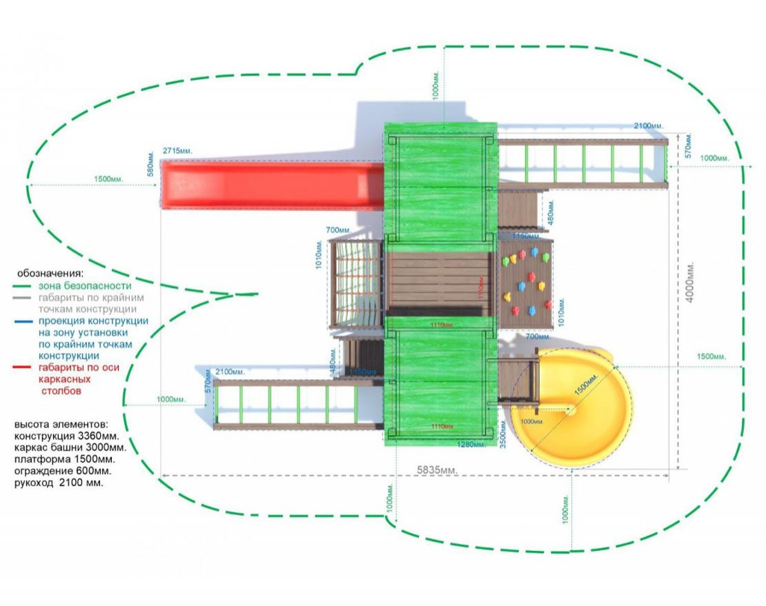 Для безопасной эксплуатации конструкции, площадка должна быть свободна от зеленых насаждений, сооружений и других конструкций, ровная, без перепадов уровня, без впадин и насыпей. Габариты площадки с учетом зоны безопасности длина 8435мм. ширина 6000мм., площадь площадки S-50,6м². Запрещено устанавливать конструкцию в зонах с повышенным риском провалов в грунте (болотистая местность, береговая линия водоемов, в непосредственной близости с оврагами и обрывами).