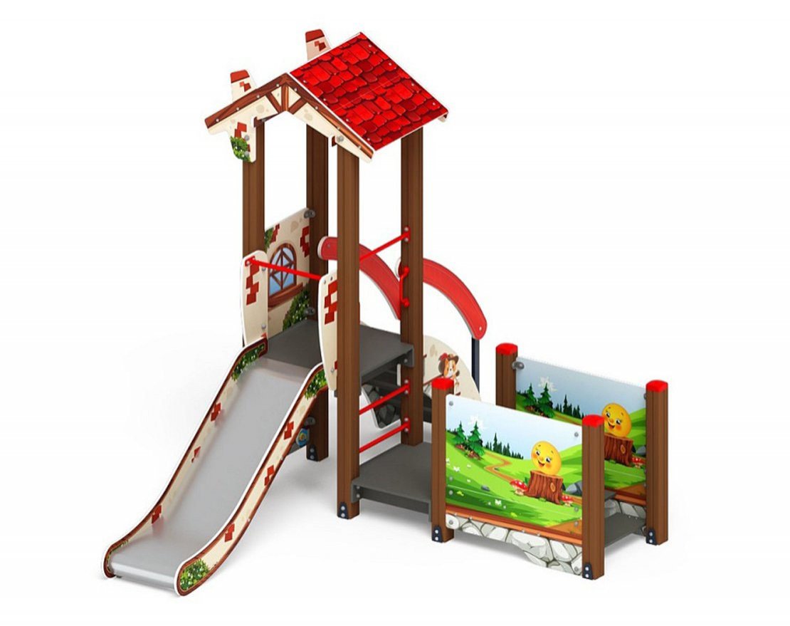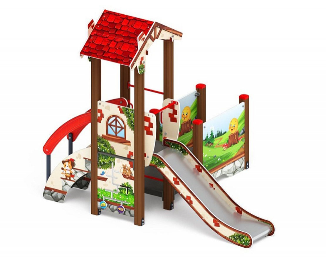 Скат горки шириной 530 мм, выполнен из нержавеющей стали t 1,5 мм, - цельного листа, борта выполнены из влагостойкой фанеры толщиной 24 мм, кромки фанеры тщательно шлифованы, борта окрашены при помощи УФ печати, принт «В гостях у сказки». Ограждения стартового участка горки, выполнены из влагостойкой фанеры толщиной 18 мм, фанера окрашена при помощи УФ печати. Опорный каркас горки выполнен из профиля 40х25 и труб диаметром 32 мм (металл имеет плавные радиусы и тщательную обработку швов, покрыт порошковой краской). Габарит горки 530х 1680х900(h). Горка поставляется в собранном виде.