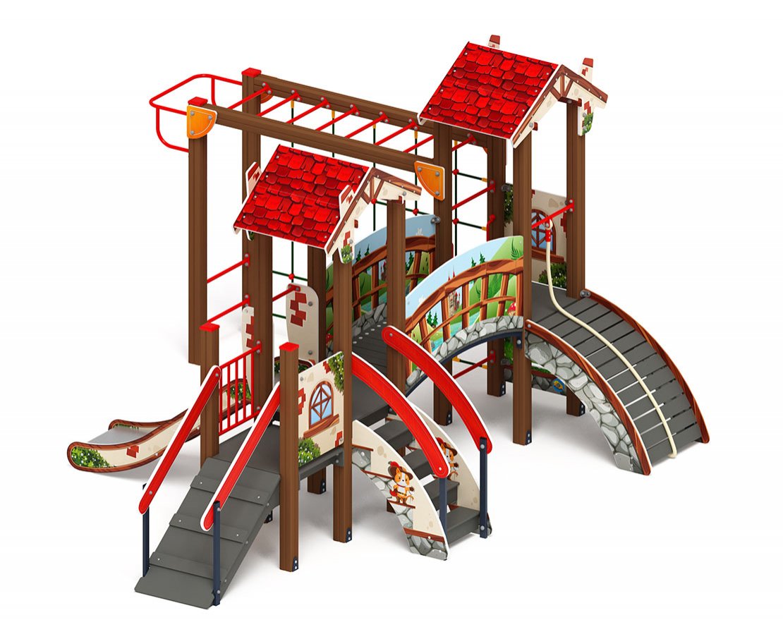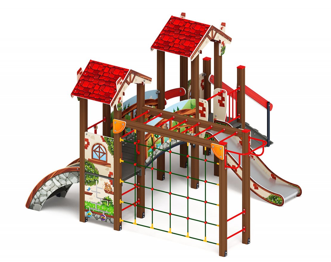 Одна выполнена из четырёх клеёных брусьев 100х100 мм высота 2500 мм, окрашенных в коричневый цвет; пол из ламинированной фанеры, с анти-скользящим покрытием, толщиной 18 мм; над башней двускатная крыша из влагостойкой березовой фанеры, по аркам – арки из влагостойкой фанеры - арки стилизованы под стропила, кромки фанеры тщательно шлифованы. На крыше нанесен рисунок имитирующий черепицу. Отметка пола башни от планировочной отметки площадки 900 мм.