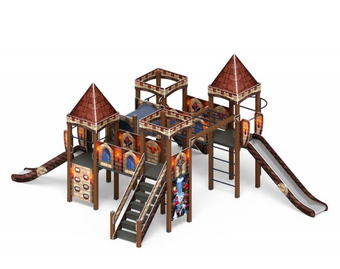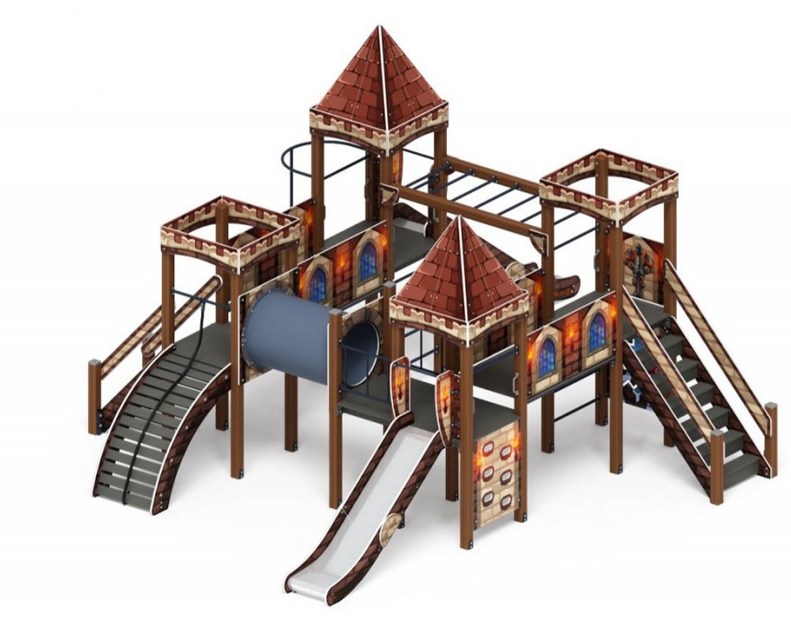 Выполнены из четырёх клеёных брусьев, окрашенных в коричневый цвет, габаритами не более 100х100мм, высота 3000 мм (две башни) и 2500 мм (одна башня). Пол из ламинированной фанеры, с анти-скользящим покрытием 1000х1000 мм толщиной 18мм; над одной башней имеются четырехскатные крыши. Купол крыши выполнен из влагостойкой фанеры толщиной 12 мм, купол состоит из 8 элементов габаритом 1070х490х12мм. Купол поставляется в собранном виде. Крыши дополняются четырьмя декоративными арками, из влагостойкой фанеры толщиной 18 мм. Арки расположены по верхнему уровню опорных брусьев. Арки имеют габарит 1000х290х18 мм. Купол и декоративные арки окрашены с нанесением принта «Средневековый». Размер башен 1000х1000х3960(h)-башни с крышей и 1000х1000х3070(h)- первая башня с аркой, 1000х1000х2570(h)- вторая башня с аркой. Одна башня (спаренная) выполнена из четырех клеёных брусьев 100х100мм высотой 2500мм и двух высотой 2200 мм. Габарит 1000х1815х3455 мм. Отметка пола от планировочной отм площадки 1200 мм - две башни. Отметка пола от планировочной отм площадки 1500 мм - две башни.