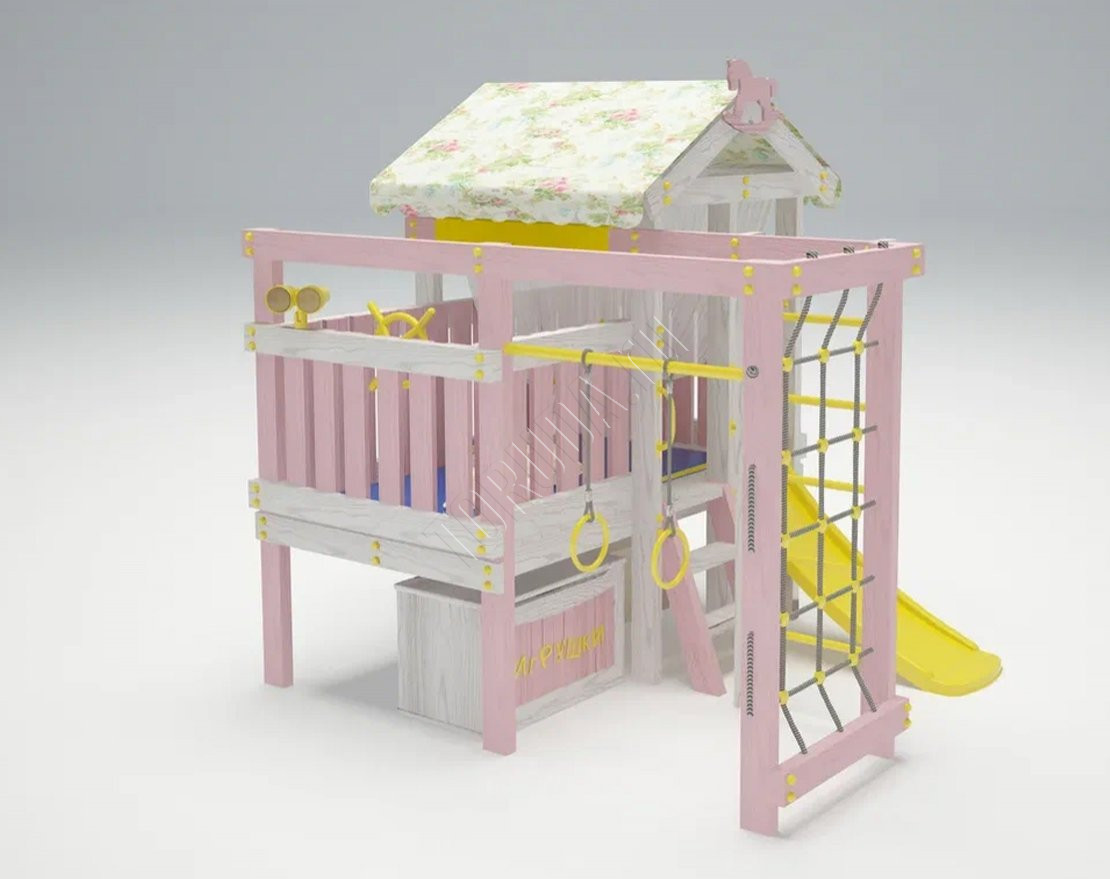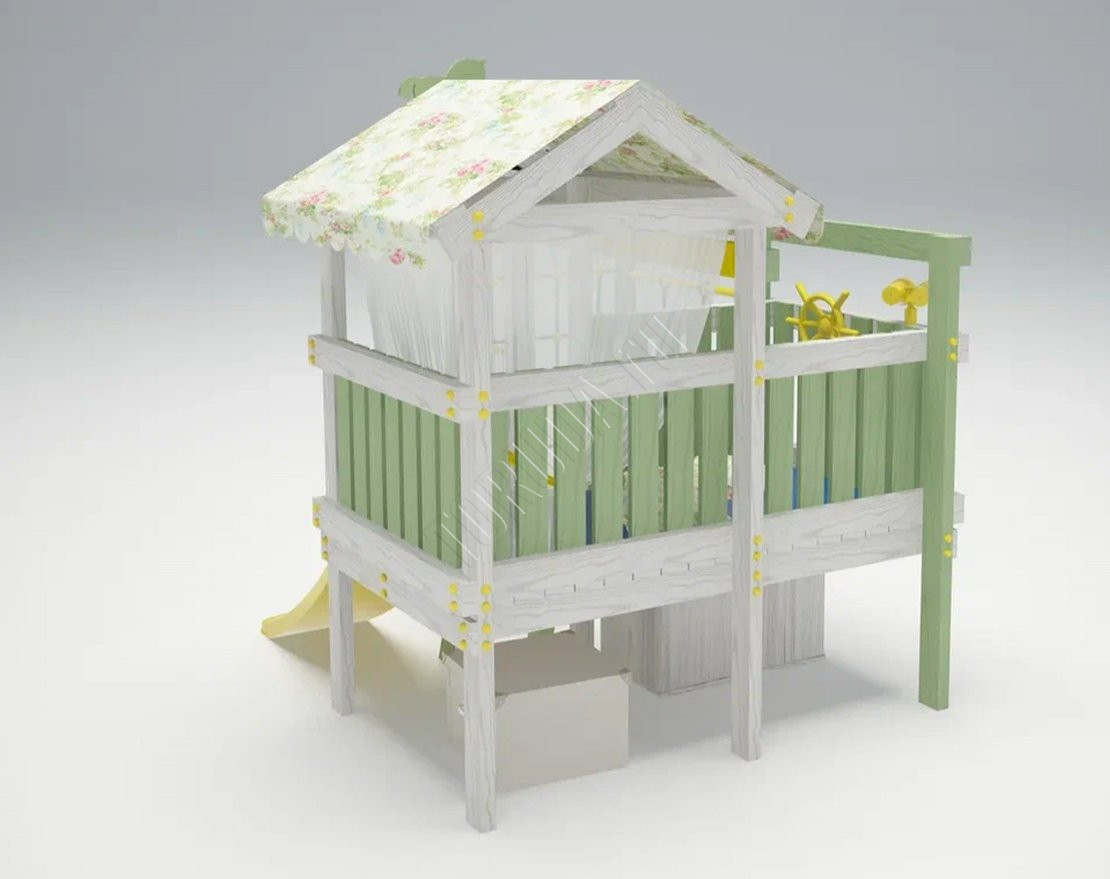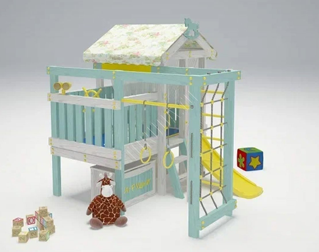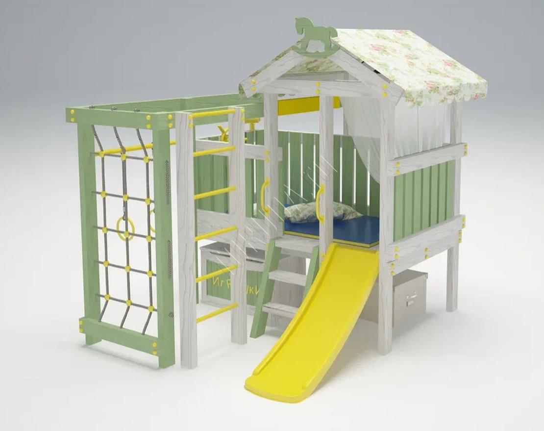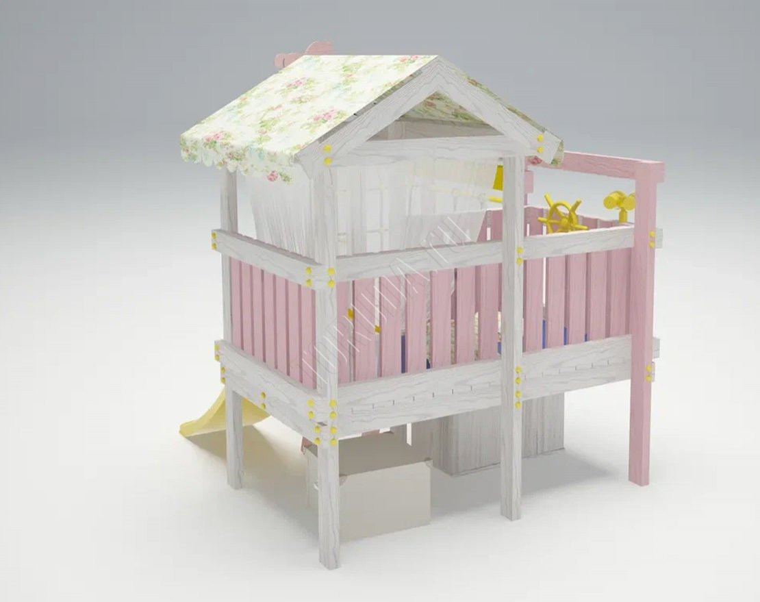 - Модель включает в себя три объединенных зоны: домик на платформе высотой 60 см, балкон и спортивный комплекс. Пространство под детской площадкой позволит хранить небольшие ящики. Ребёнок может положить туда мягкие игрушки, машинки, мячи и прочие предметы.