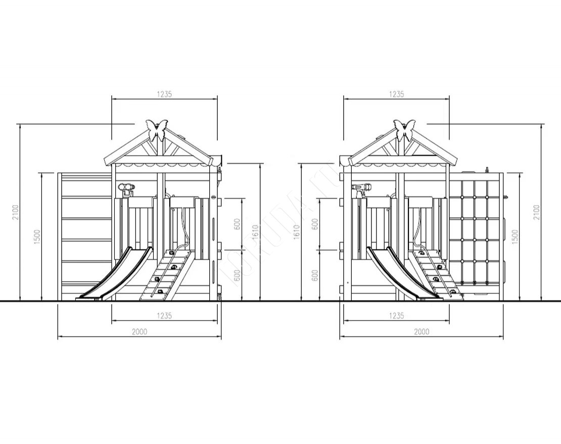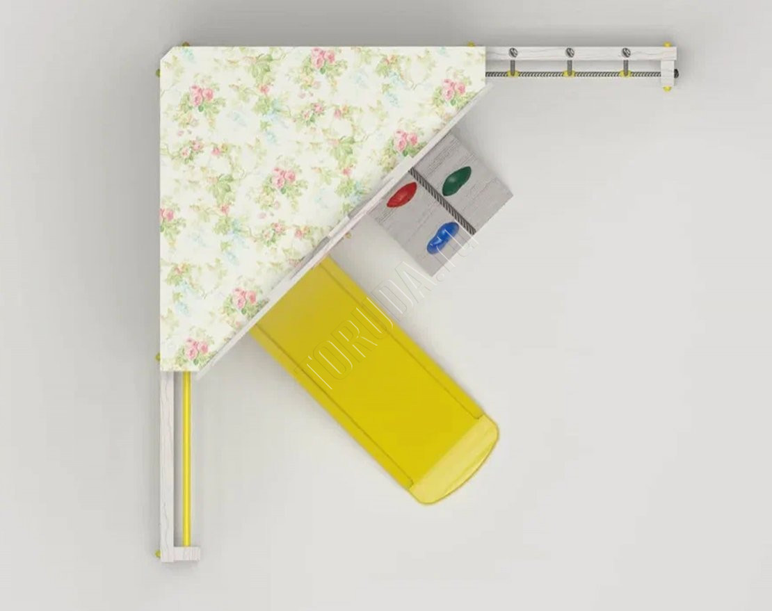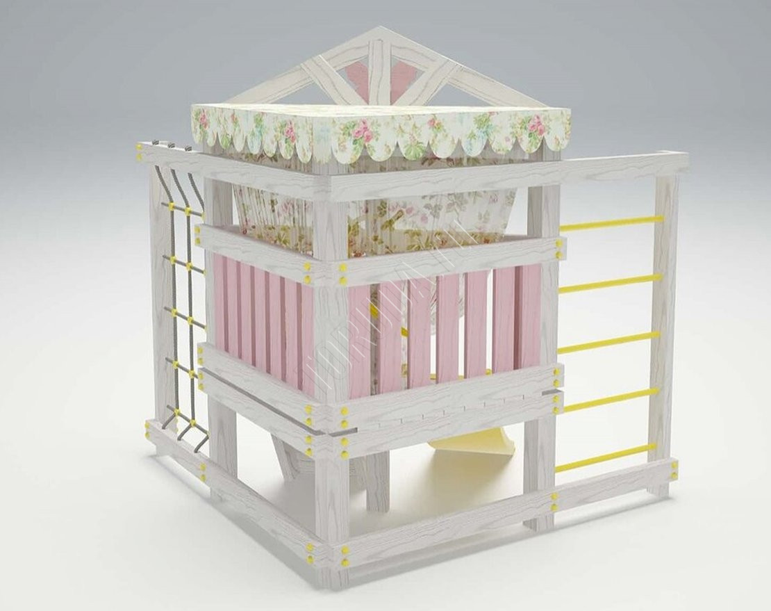 Спортплощадка поместится даже в маленькие детские комнаты. Её основа – игровая башня, по бокам от которой установлено спортивное оборудование. Домик стоит на платформе высотой 0,6 метра. Чтобы попасть внутрь, нужно преодолеть скалодром с разноцветными выступами и канатом.