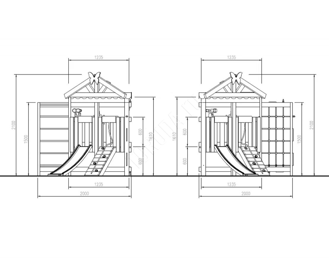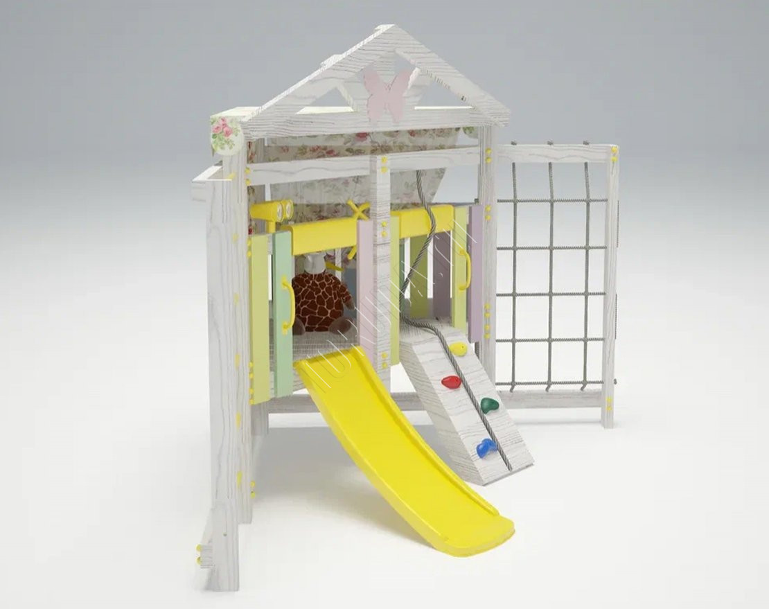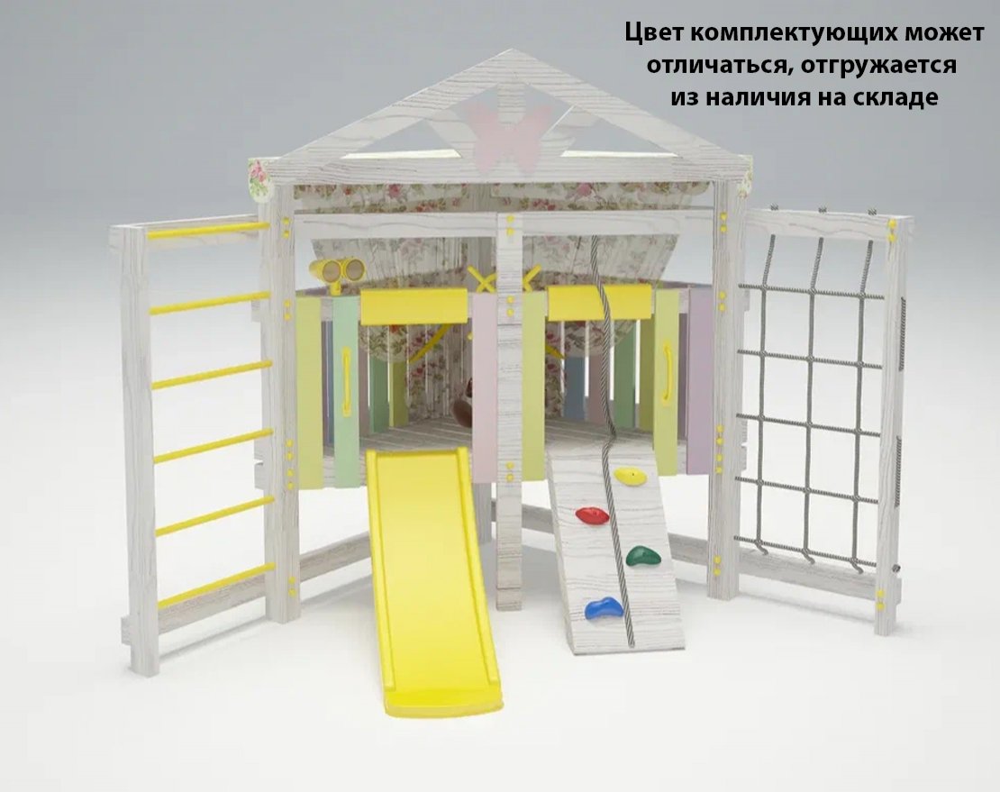 Главная часть игрового комплекса – уютный домик под крышей. В него можно забраться по скалодрому, держась за канат. Там можно отдохнуть, поиграть и порулить за штурвалом. А потом весело спуститься с горки! Также дети могут позаниматься на шведской стенке или полазать по канатной сетке, тренируя ловкость, силу рук и выносливость организма.