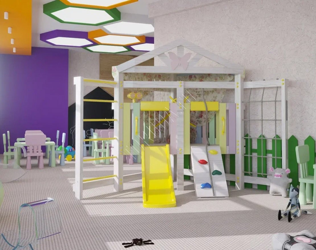 Это угловая площадка, что позволяет разместить её в помещении, в доме или в квартире, не занимая лишнего пространства.
