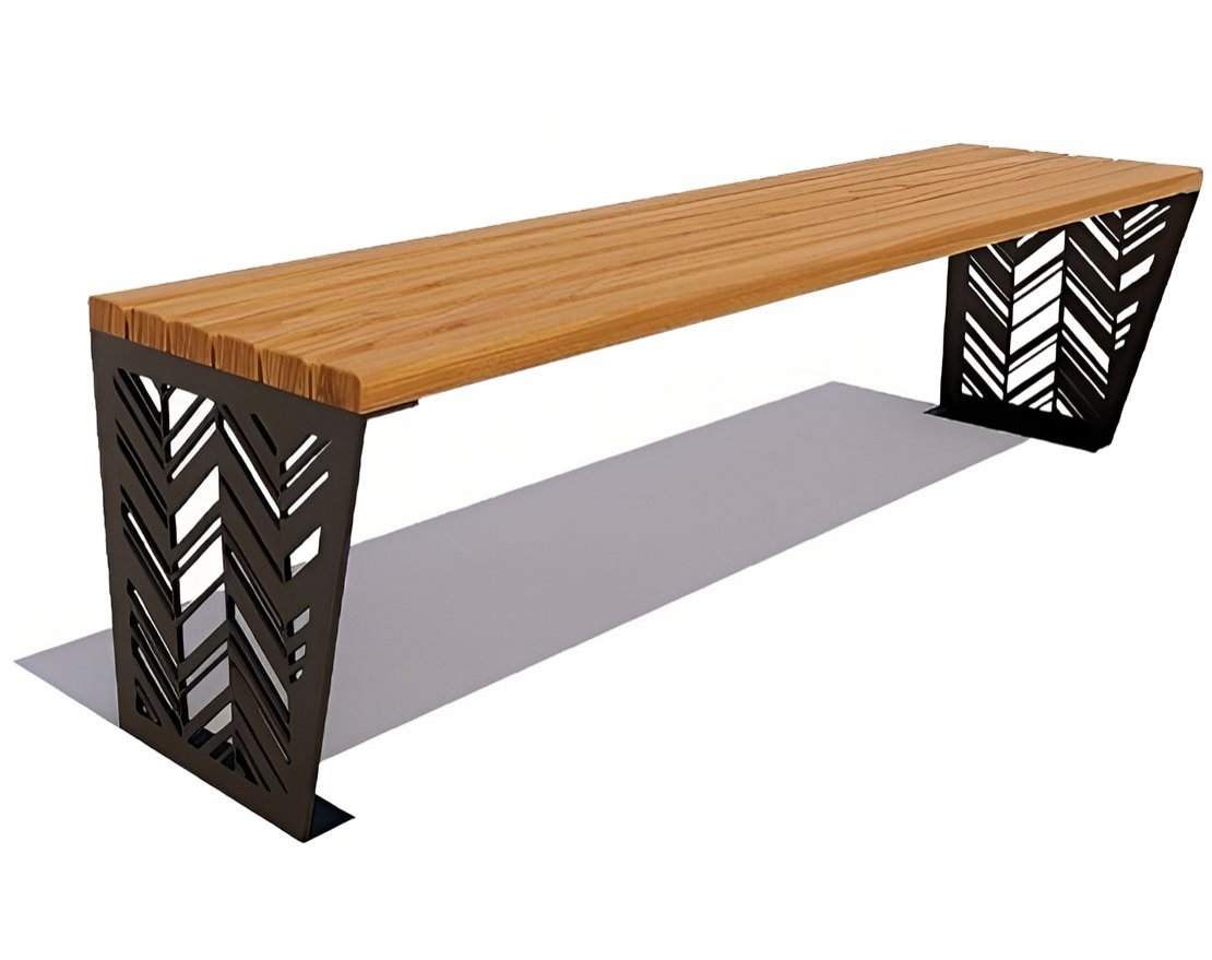 Простая, но прочная банкетка «Гарнизон» без спинки, сделанная на стальном каркасе, имеет геометрический орнамент на боковинах. Сидение выполнено из ангарской сосны. Размеры идеально подходят для небольших улиц и дачных участков.