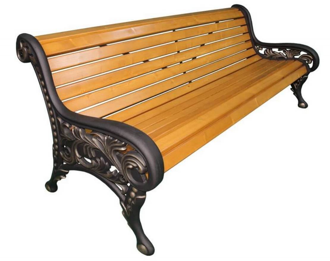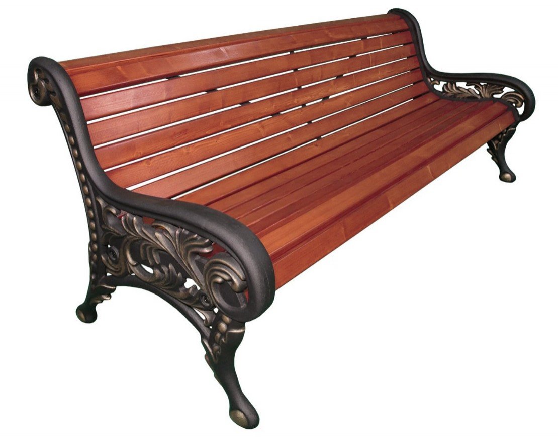 Парковая скамейка с подлокотниками и высокой спинкой выполнена в классическом стиле. Основой конструкции служат массивные боковины из чугунного художественного литья. Они покрыты порошковой полимерной краской черного цвета с бронзовой патиной, что защищает их от атмосферных осадков и выгорания на солнце. Деревянные элементы защищены современными лакокрасочными материалами, что продлевает срок службы изделия.