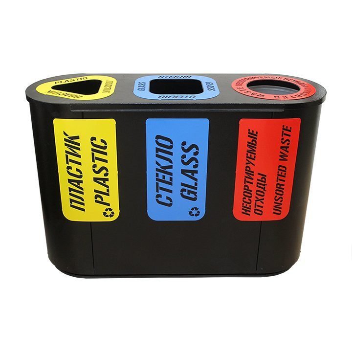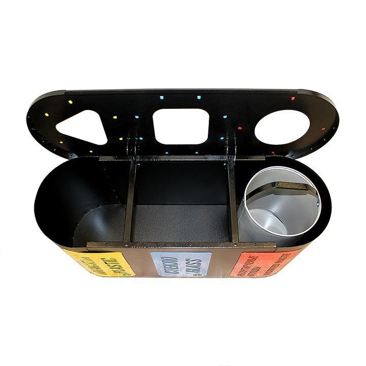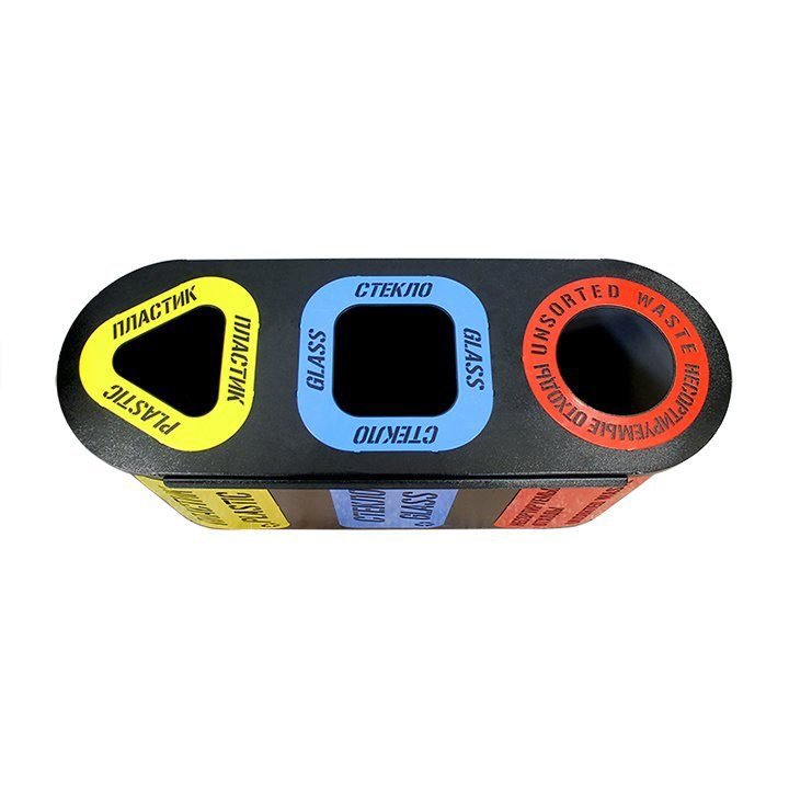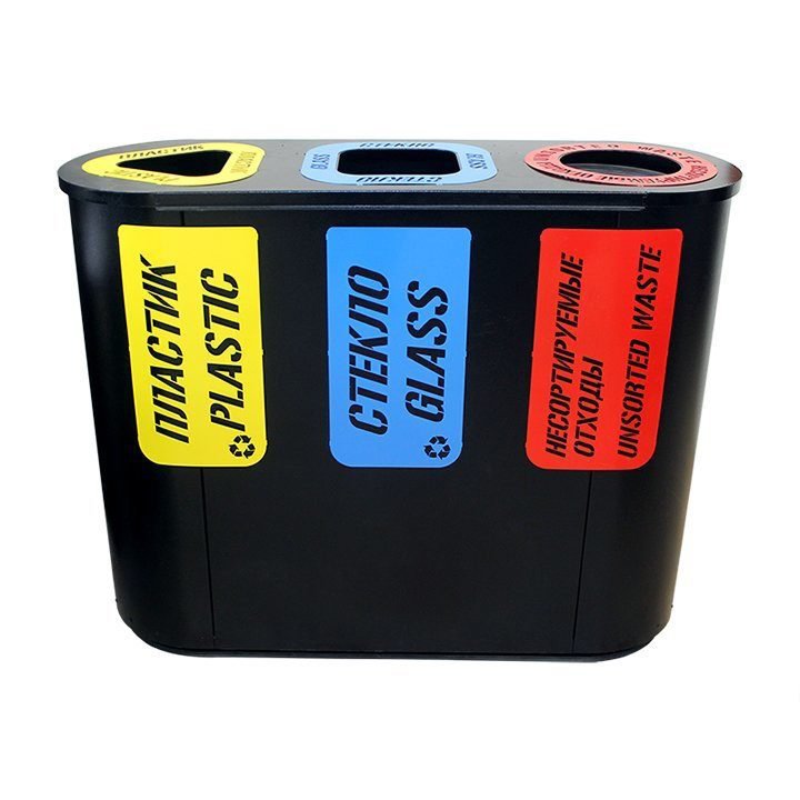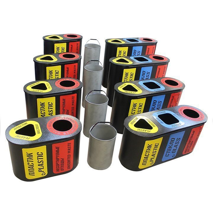 В стандартную комплектацию каждой секции входит: внутренний стальной бак с удобной ручкой, металлическая накладка с указанием вида собираемого мусора, окрашенная в жёлтый (пластик), красный (несортируемые отходы) или синий (стекло) цвет.