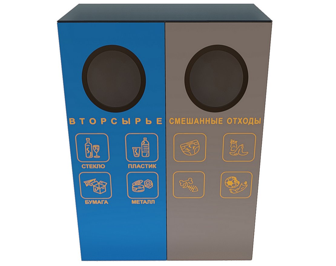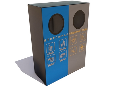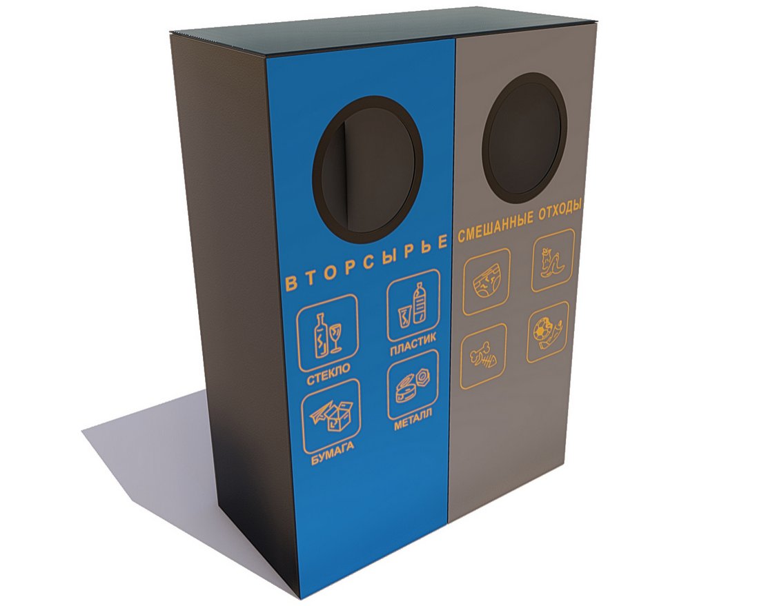 Урна «Проспект» имеет 2 прорези для мусора. В первую помещают то, что можно отправить на вторичную переработку: стекло, пластик, бумагу, металл. Вторая предназначена для смешанных отходов. Чтобы чистить баки, на тыльной стороне смонтирована дверца.