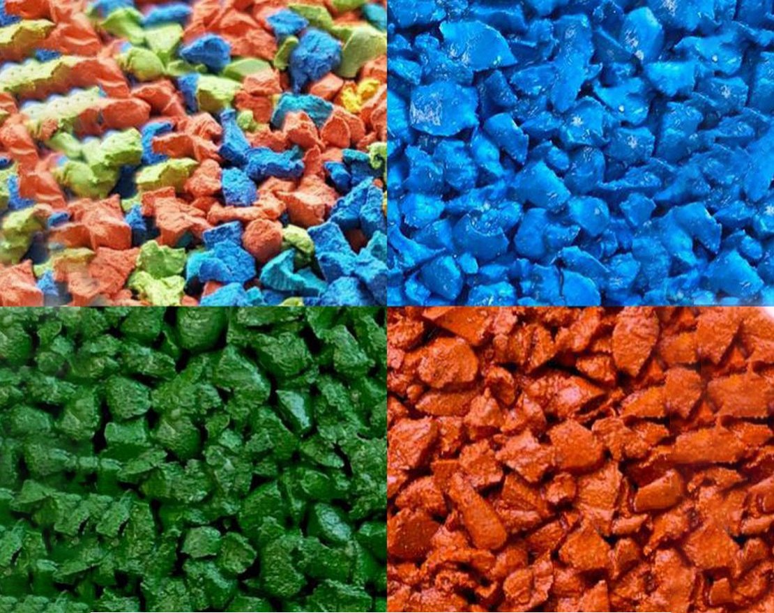 Преимущество перед резиновой крошкой содержание в гранулах до 25 процентов натурального каучука. Покрытия получаются мягкими и безопасными. Отлично подходят для детских, спортивных площадок и дорожного строительства.