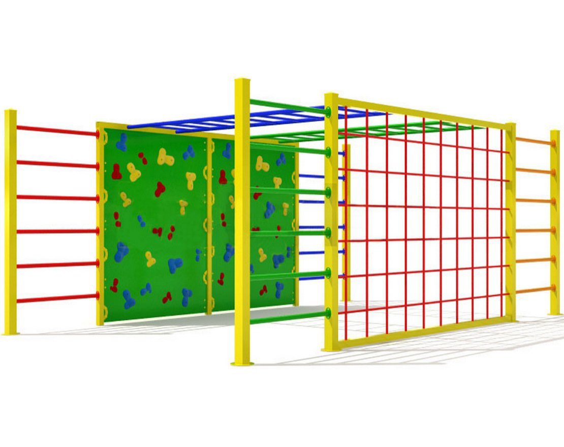 Большой, просторный, арочного типа детский спортивный комплекс приглянется ребятне любого возраста. Здесь объединено всё, что может понравиться детям и подросткам. Классические лестницы соседствуют с огромной стеной для скалолазания, напротив – лестница-клетка, завершают конструкцию удобные рукоходы.
