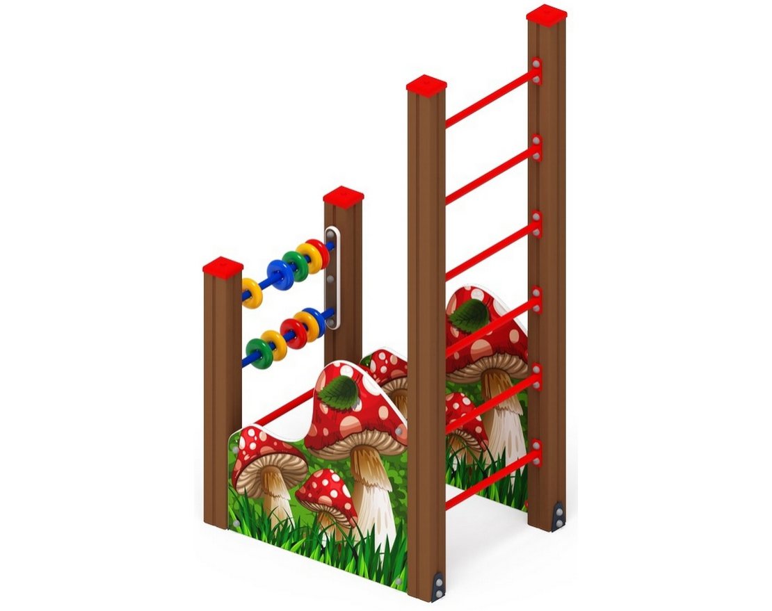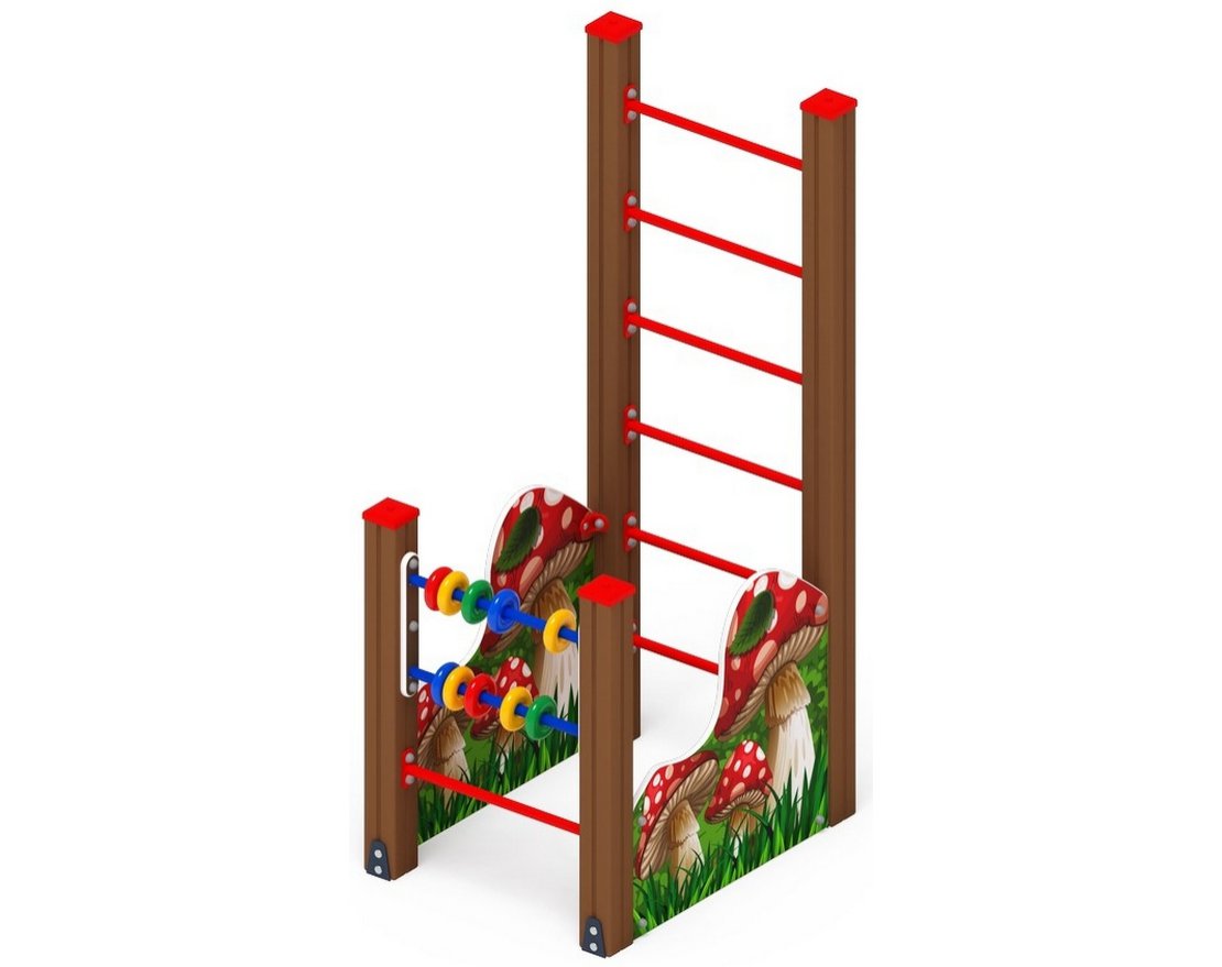 Борт выполнен из березовой фанеры толщиной 15 мм, и габаритами 820х800. Фанера имеет тщательную обработку торцов и окраску желтого цвета. Стилизованы под гриб мухомор.