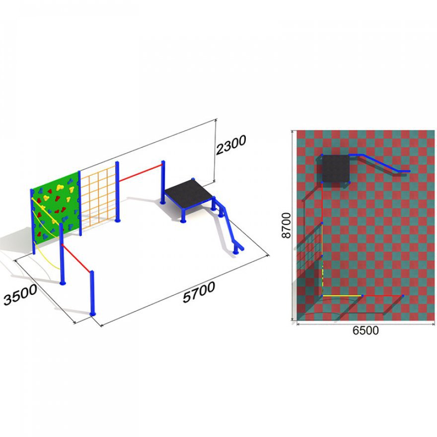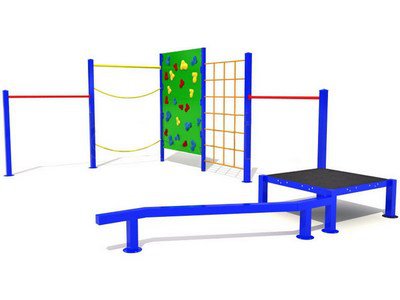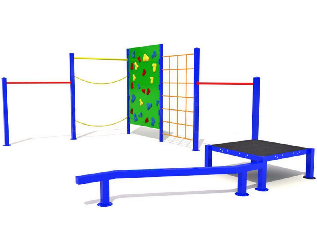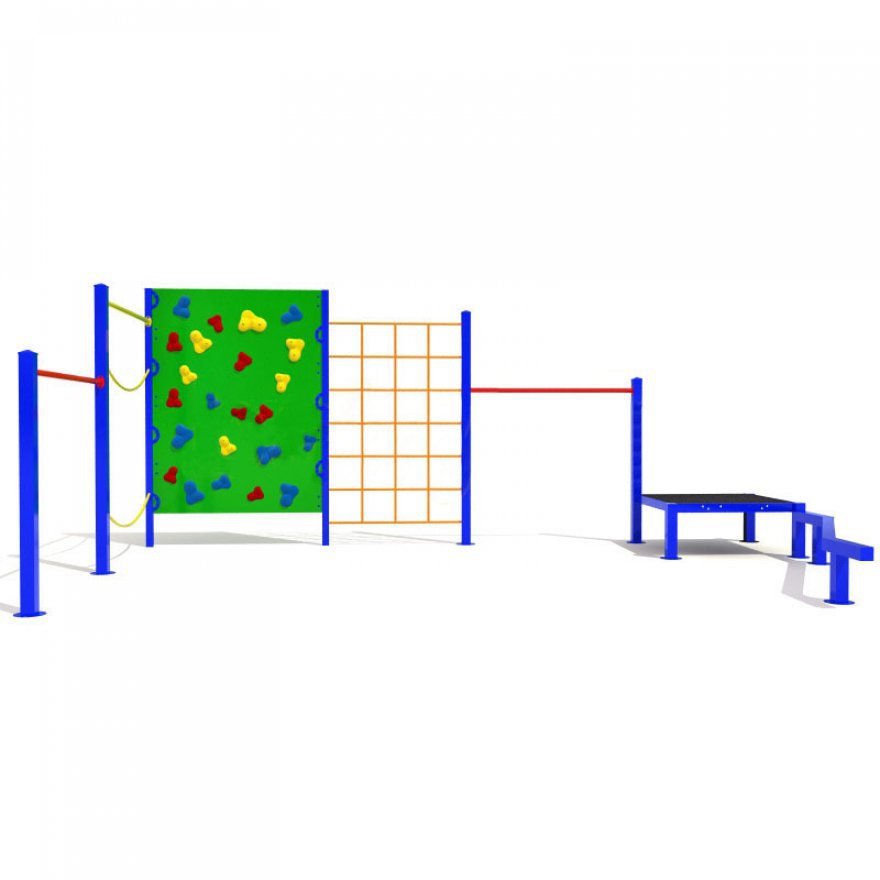 Детский уличный спортивный комплекс объединил в себе основные элементы для занятия спортом, тут и имитация скалодрома, и турники, и небольшая платформа с профессиональным настилом для занятий, и канатная стенка. Устоять против такого искушения потратить энергию не получится ни у одного ребёнка!