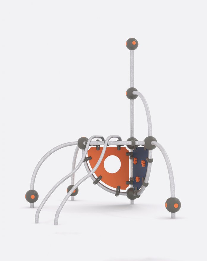 Состоит из металлического каркаса и пластиковой панели со скалодромными зацепами, трубами для лазания и турниками.