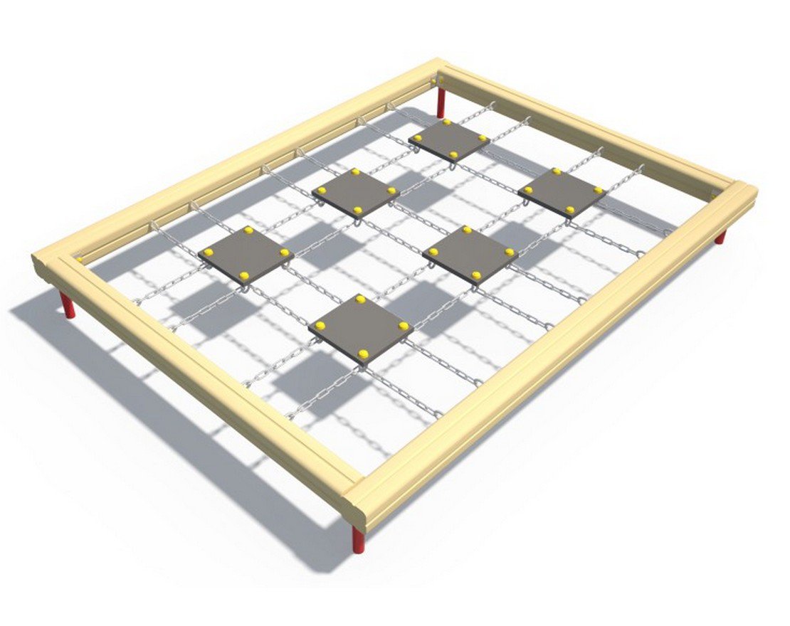 Полоса препятствий состоит из ступеней подвешенных на цепях на каркасе из бруса. Столбы каркаса полосы препятствий должны быть выполнены из клееного бруса сечением 90х90 мм. Снизу к каркасу крепятся металлические закладные сечением Ø 32 мм, который бетонируется в землю. Ступени выполнены из ламинированной фанеры толщиной 18 мм. Деревянные детали должны быть тщательно отшлифованы, загрунтованы и окрашены профессиональными двухкомпонентными красками в заводских условиях. Металлические элементы должны быть окрашены порошковыми красками в заводских условиях.