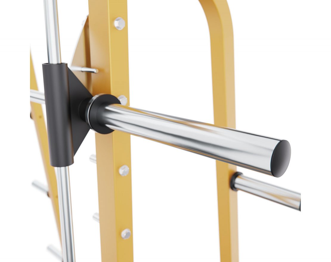 Каркас изготовлен из прочной стали с профилем 70 х 50 х 2 мм, что гарантирует устойчивость и долговечность конструкции. Машина оснащена встроенным грифом длиной 180 см с посадочным диаметром 50 мм и максимальной нагрузкой до 300 кг. Для хранения дисков предусмотрено 6 посадочных мест диаметром 50 мм, каждое из которых выдерживает нагрузку до 150 кг.