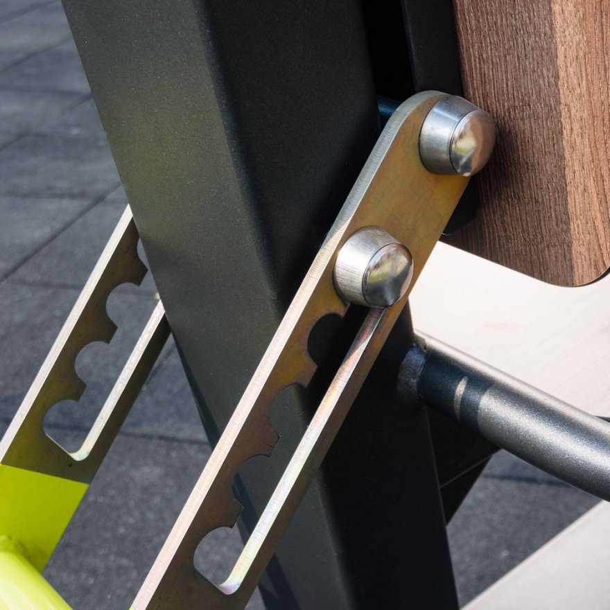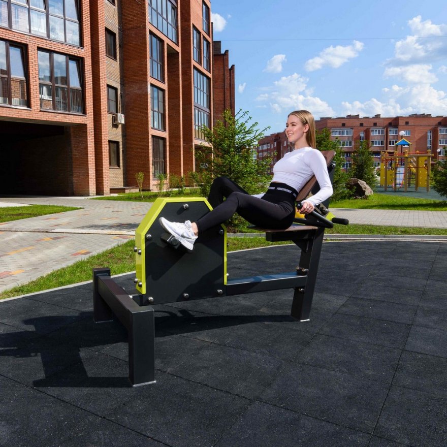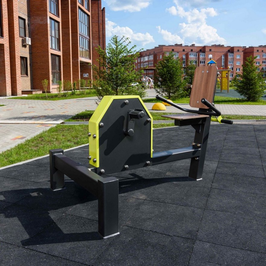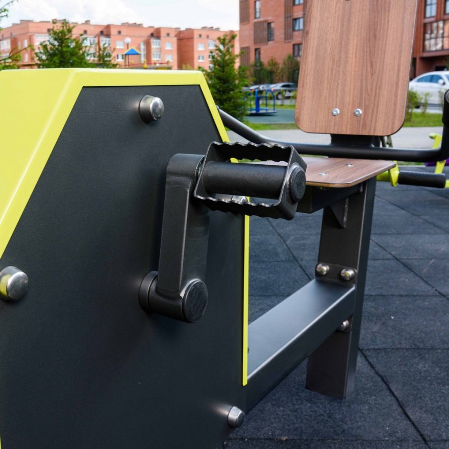 Несущая конструкция уличного тренажера выполнена из профильных труб 120*180*5 мм. Фланцевое соединение для монтажа тренажера 300*300*8 имеет 4 овальных отверстия, для регулировки установки тренажера, под болтовое крепление М16. Цокольная опора крепления выполнена из листового металла 8, 6 мм, и гильзы из трубы 80х80х3 длинной 700 мм. Подвижные рычаги изготовлены из профильной трубы 60*60*3 и трубы 57х3, с деталями, изготовленными из листового материала толщиной 3 мм. Подшипниковые узлы обеспечивают рабочее движение рычагов.