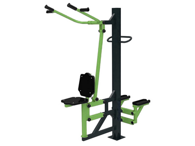 Уличный тренажер "Вертикальная тяга" предназначены для тренировки трицепсов и мышц груди. Сядьте на сиденье спиной к стойке, возьмитесь за параллельные или поперечные рукоятки и потяните на себя, затем плавно поднимите. При этом сиденье поднимется и опустится. Усилие от рукоятей передается вертикальному движению сидения, которому противодействует вес тренирующегося.