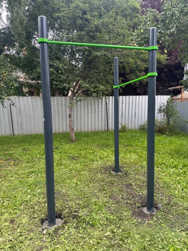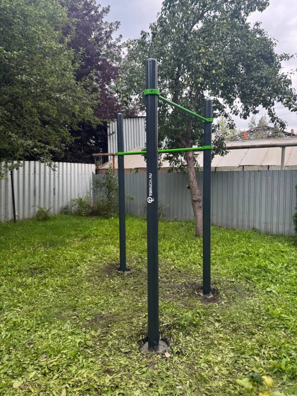 Двойной турник на хомутах. Позволяет проводить целый ряд физических упражнений, оказывающих положительное воздействие на организм занимающегося. Укрепляет мышцы рук, плечевого пояса, спины и груди.