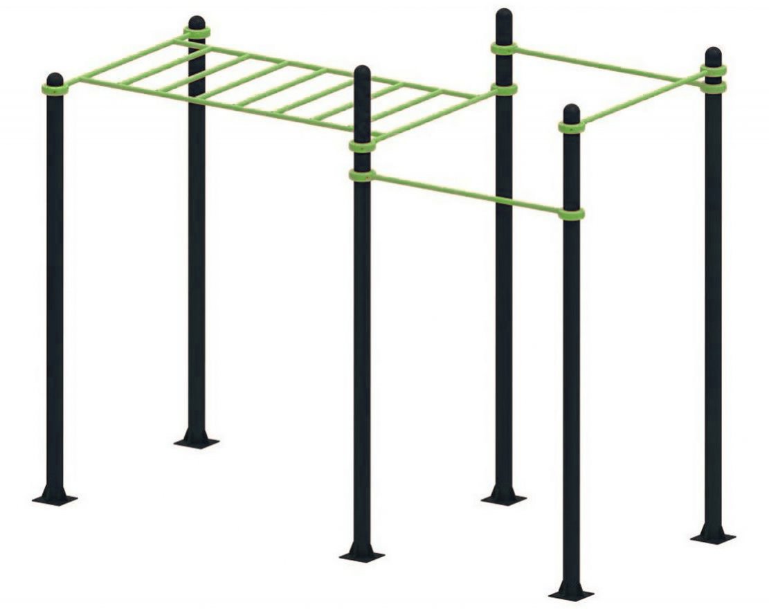 Благодаря применению хомутов, элементы комплекса регулируются по высоте, а также возможно менять расположение частей воркаута в плане, за счет применения круглых труб.